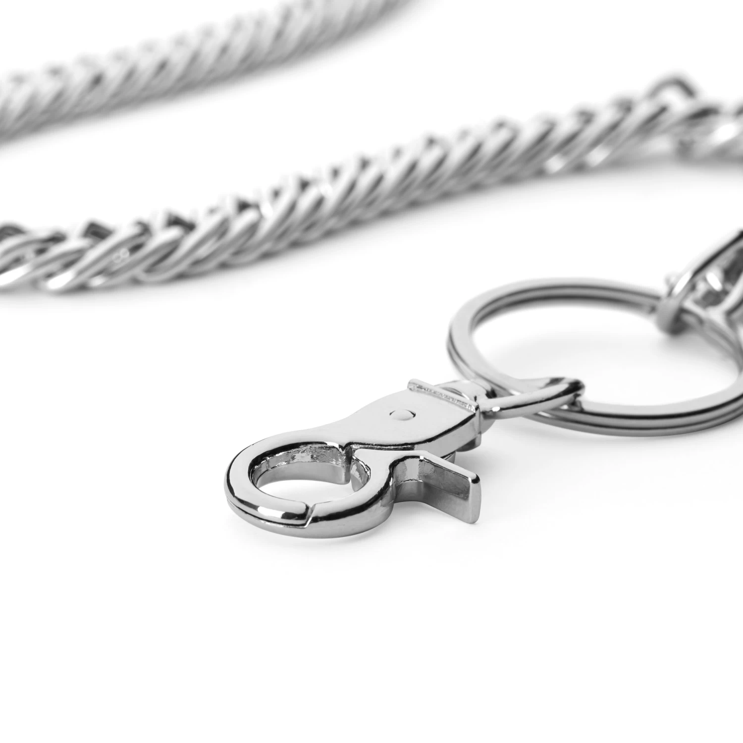 Made with nickel-free metal. One end secures to your wallet or belt loop with a lobster claw, while the other is finished with 2 keyrings. Perfect for securing your keys and carrying them in your back pocket.