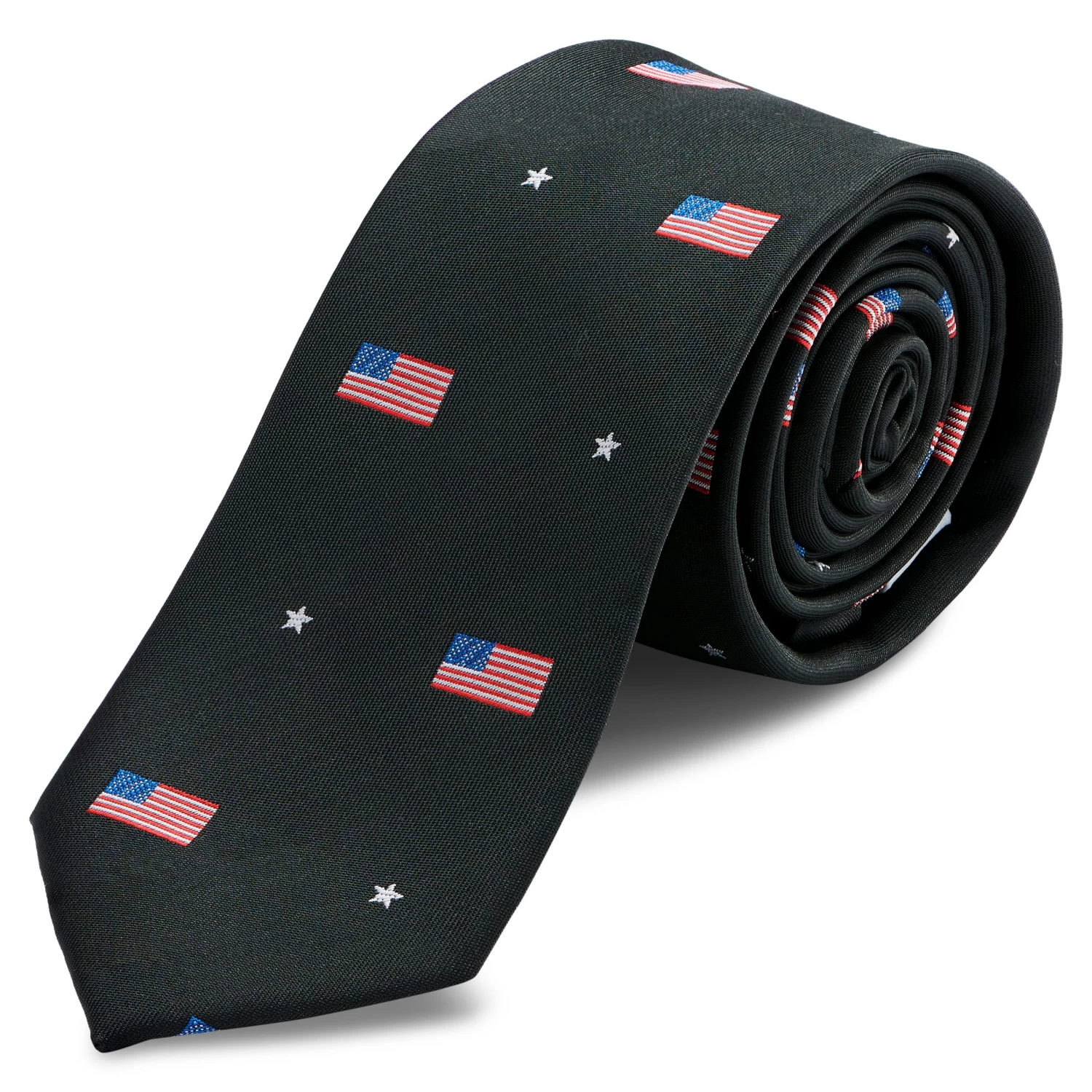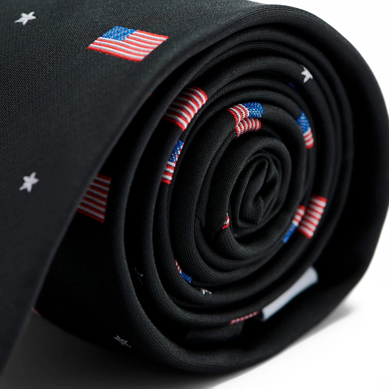 The black background is broken up with tiny American flags in the red, white, and blue that they’re famous for. Handmade from soft, durable polyester.