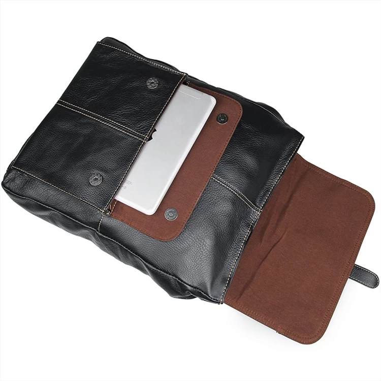 Eye-catching in matte black leather and trimmed with ecru stitch detailing. Interior is fully-lined. The front pocket, back zipped pocket and internal slip pouches neatly accommodate your accessories. Ideal for business or travel.