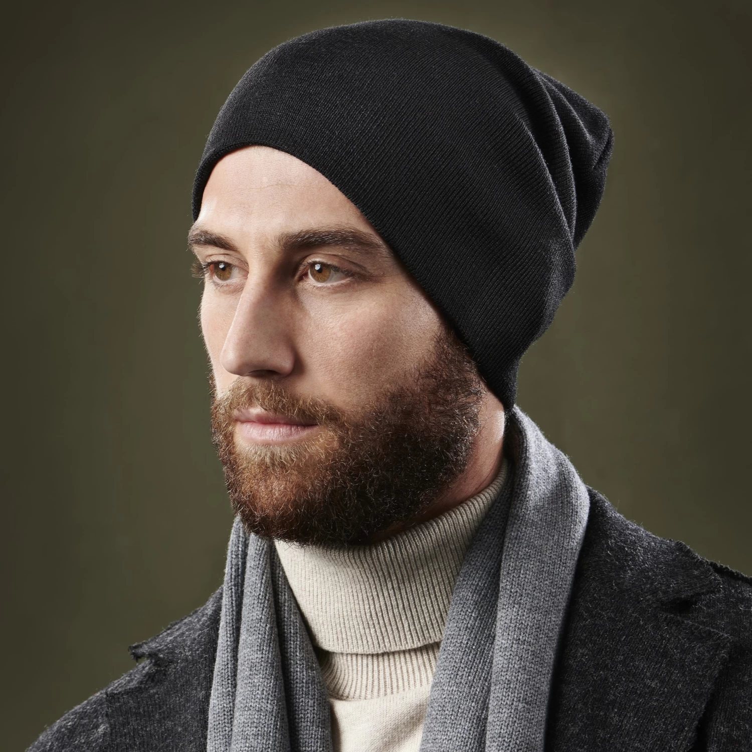 A slouchy black beanie for men is a wardrobe must-have. This one features soft, cozy knit construction from merino mix yarn to keep your head warm all season. Designed in Denmark.