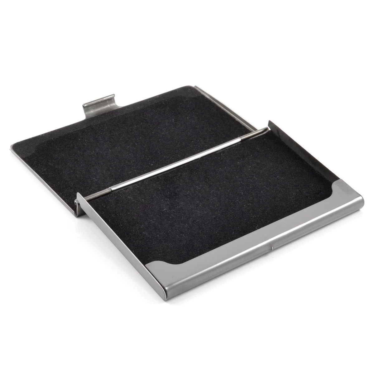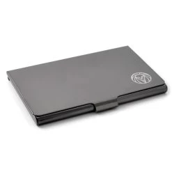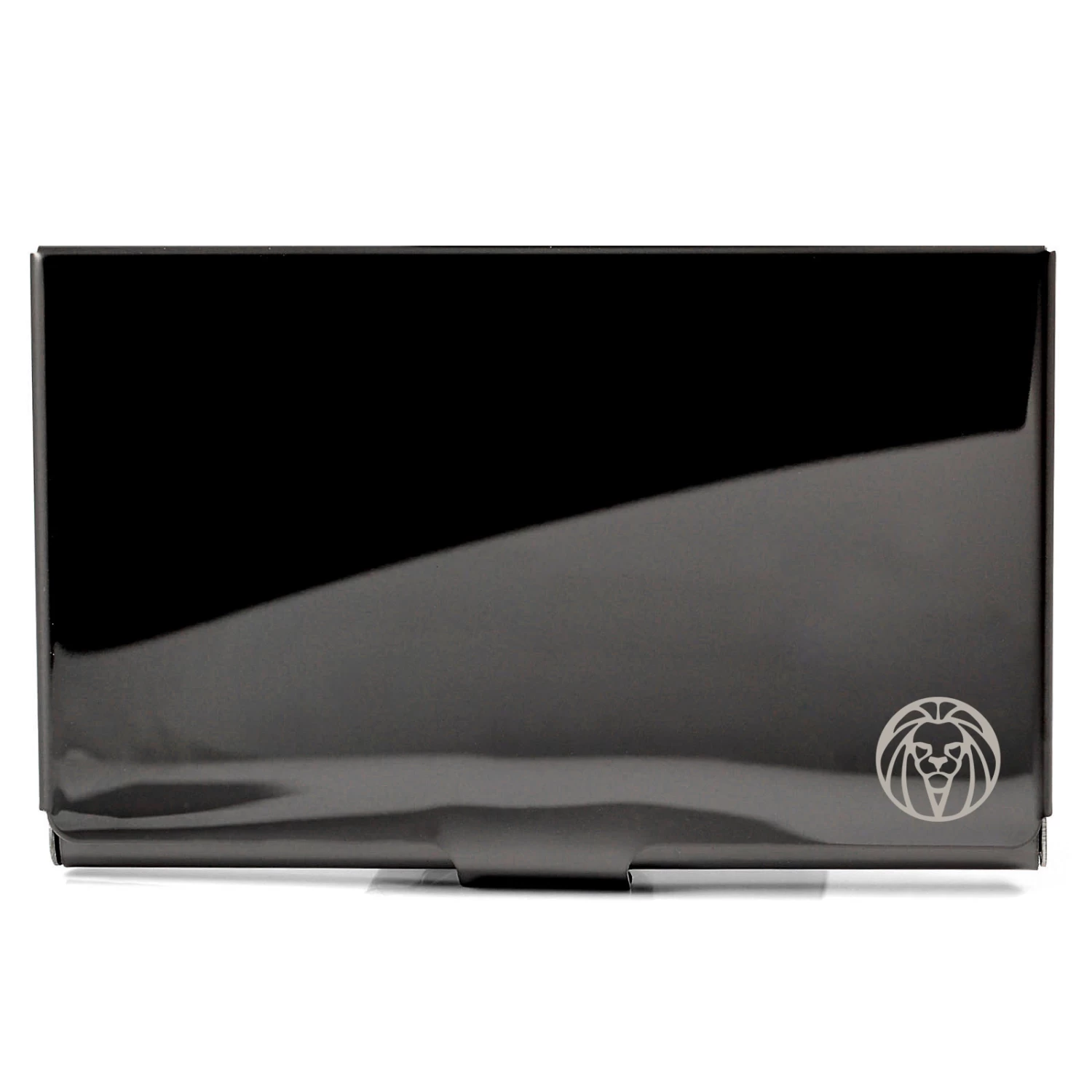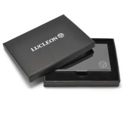 This cardholder is made of polished dark gray and black 304L steel, and features a Lucleon engraving on its lower right corner.