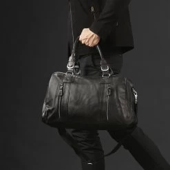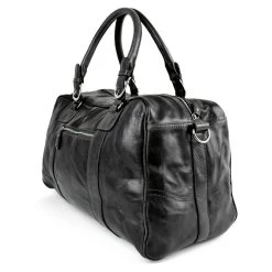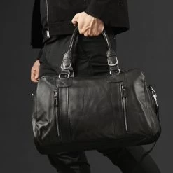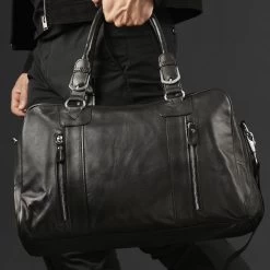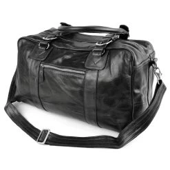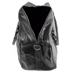 The exterior features black genuine leather construction, sturdy handles, and a removable shoulder strap. Several zippered pockets are included for easy access.