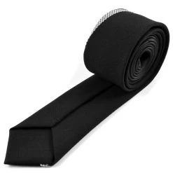 A timeless look with a twist. This slender black tie features a checkered, monochromatic stripe down its length. An eye-catching conversation starter for sure!