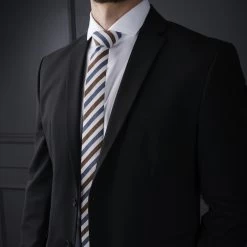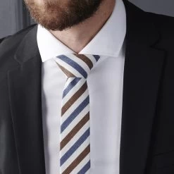 This stylish tie features crisp blue, brown and white stripes for a preppy look and feel.