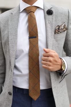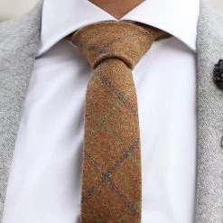 Handcrafted from a sandy shade of wool, this bespoke tie features an exquisite checkered pattern.