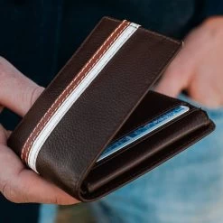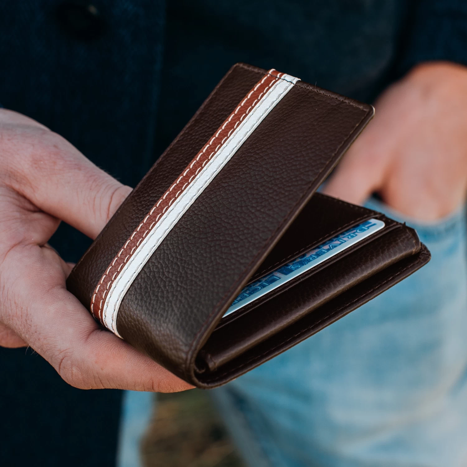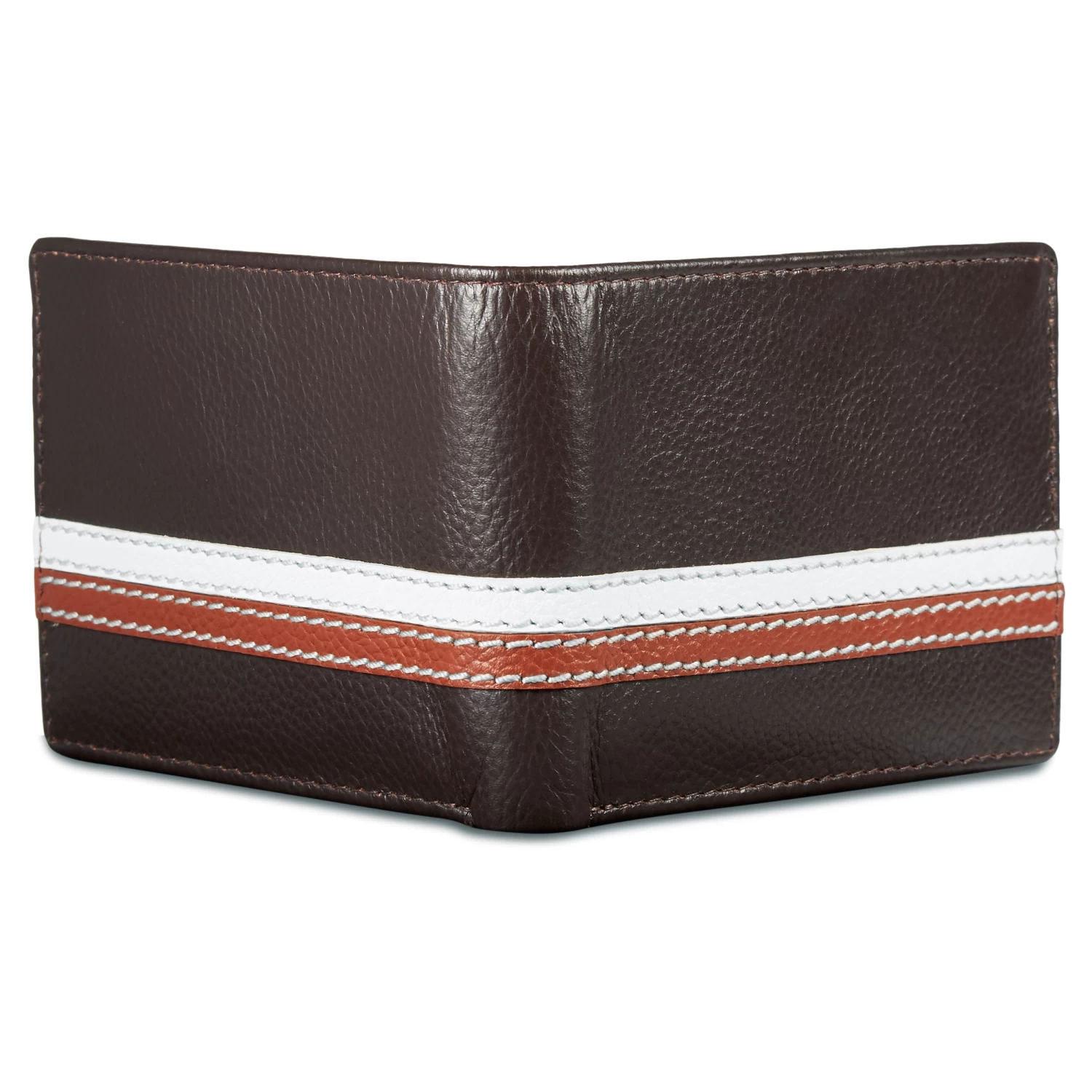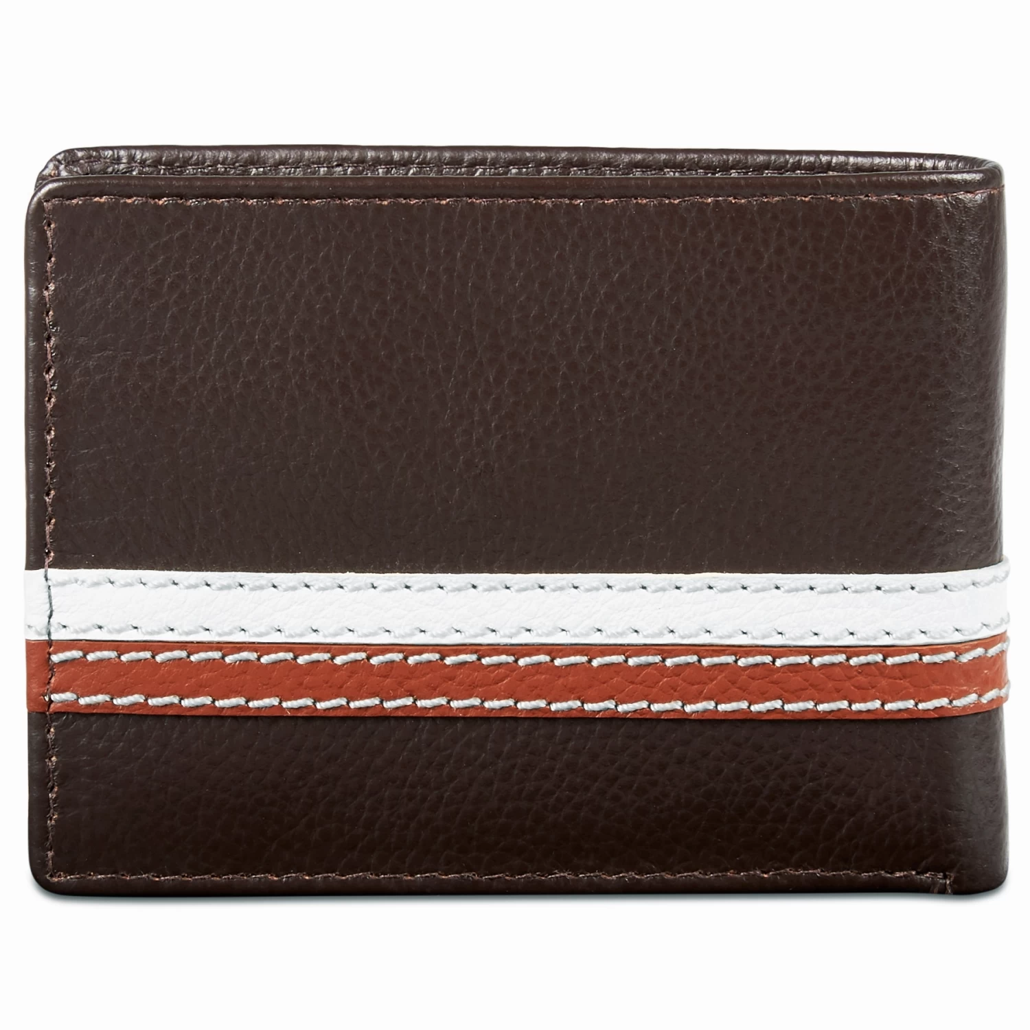 This unusual brown leather wallet for men is accented with one white and one tan stripe across its exterior.