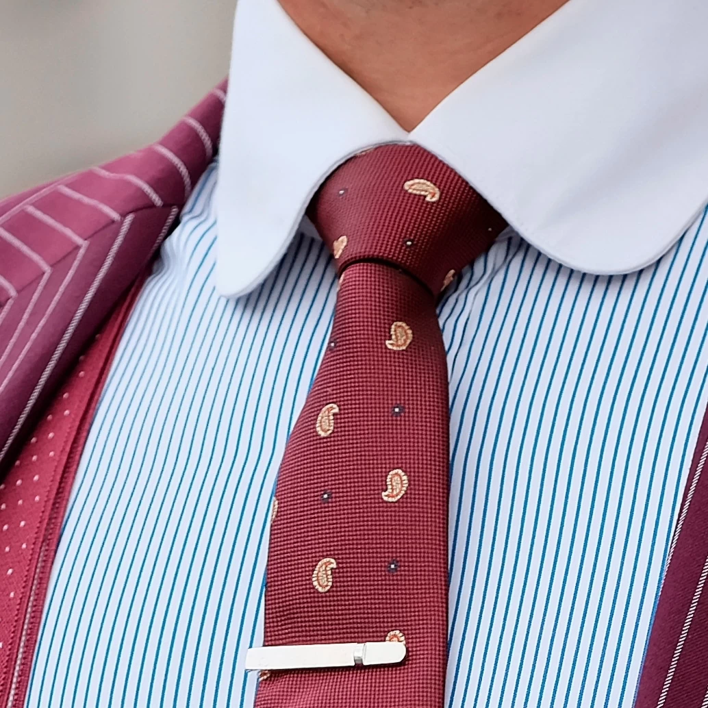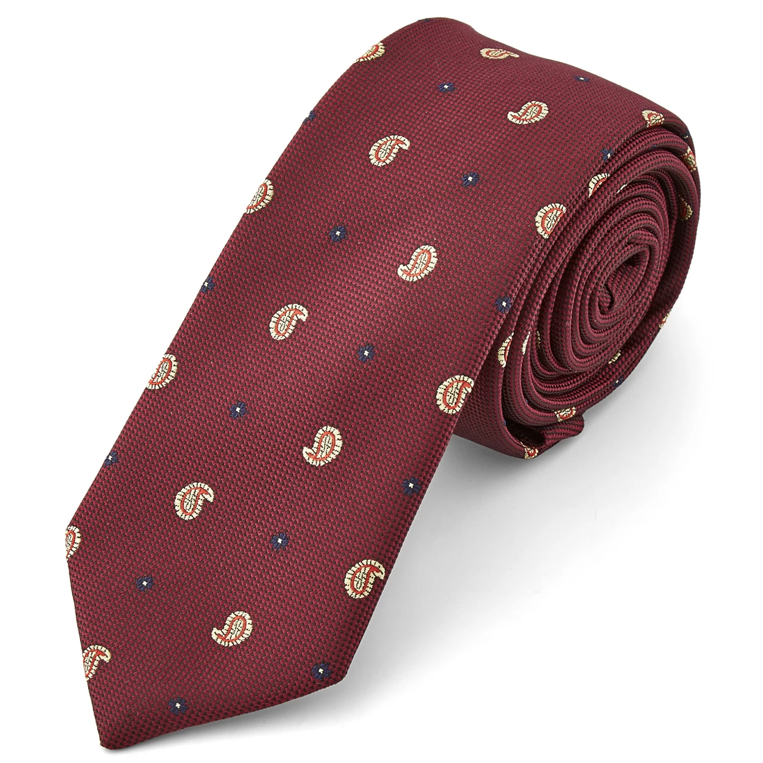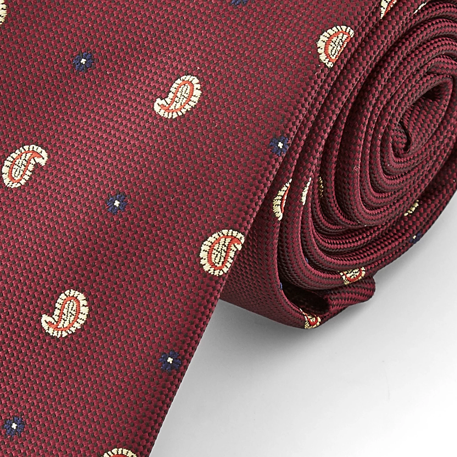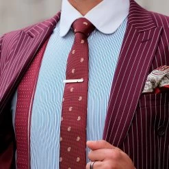 This machine-stitched tie features a repeating pattern of commas against a burgundy colored base.