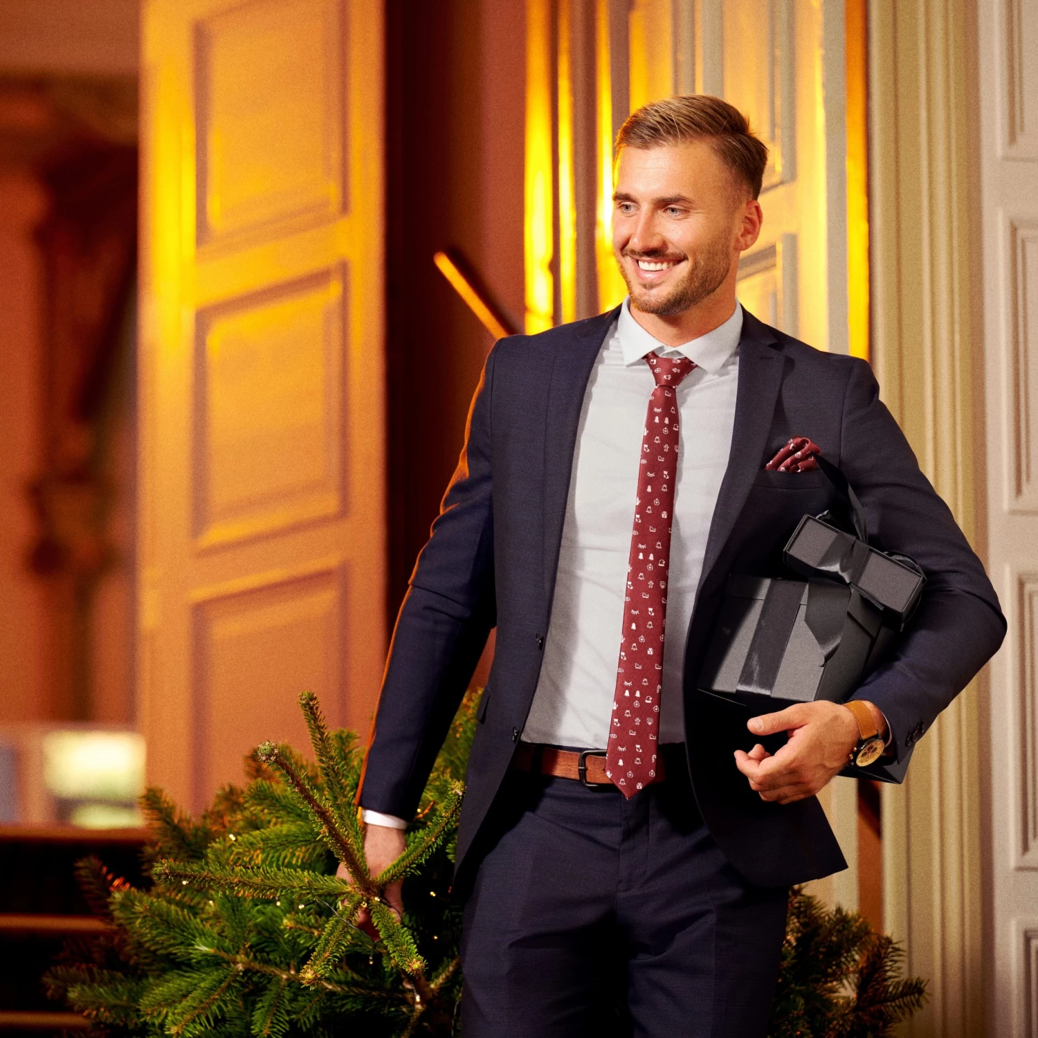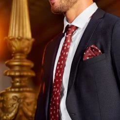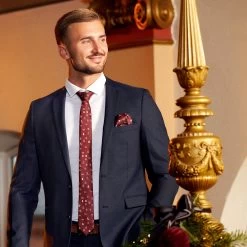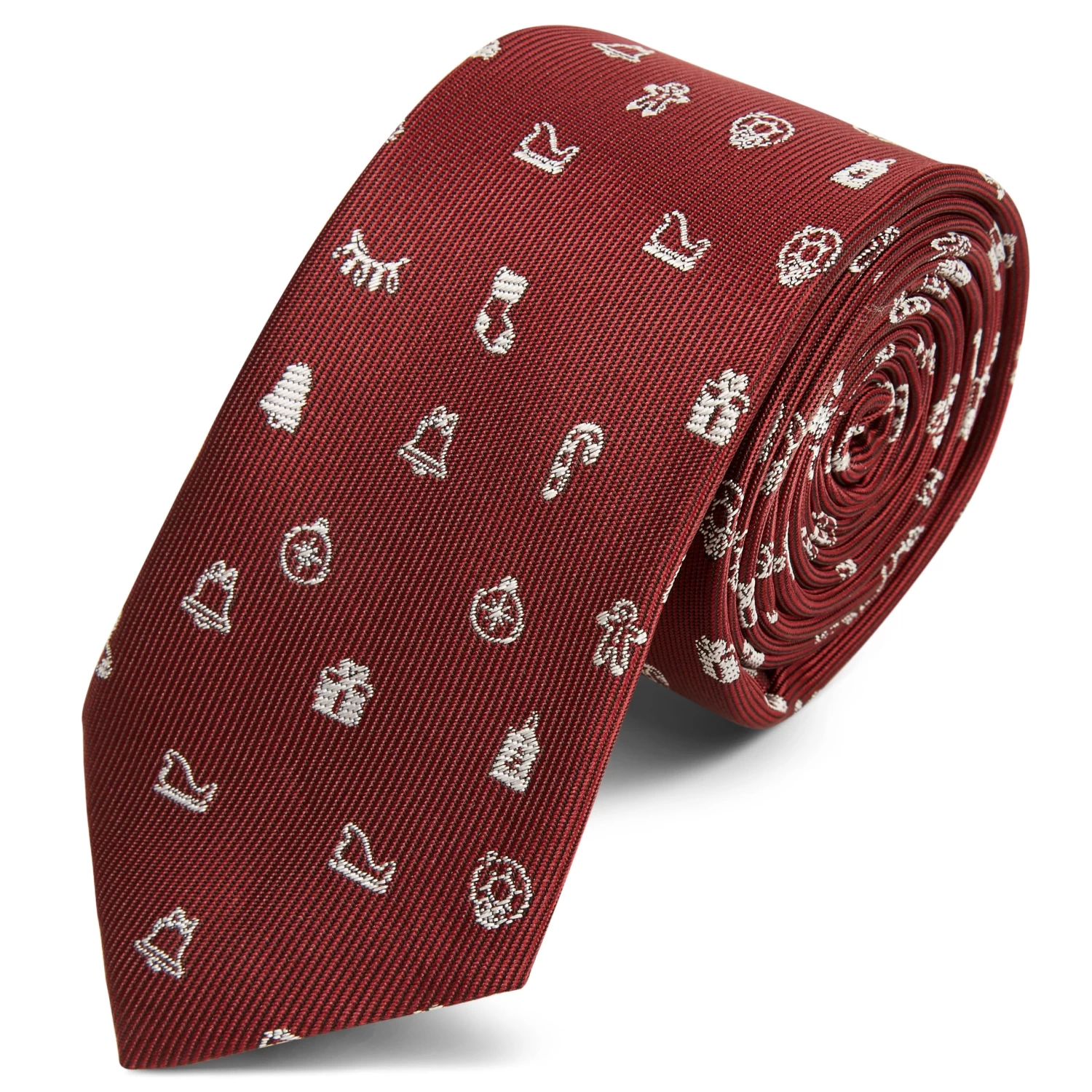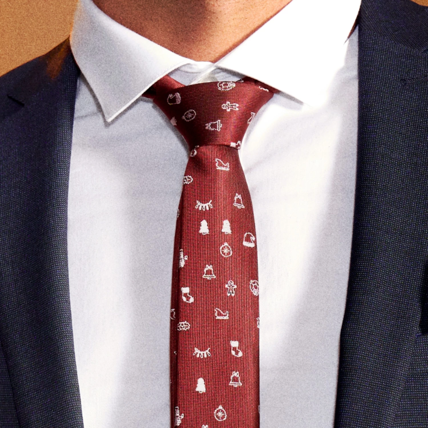 Features charming white Christmas symbols on a burgundy background. Tie it however the mood strikes you.