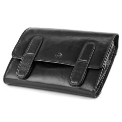 This sleek leather accessory has all the bells and whistles you could possibly want in a wash bag. High-quality cowhide construction. An easy-access exterior pocket. Strong snap closures. And that’s just on the outside. Inside are four roomy compartments and a hook to hang the bag on the door.