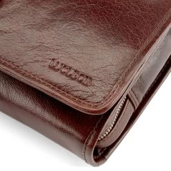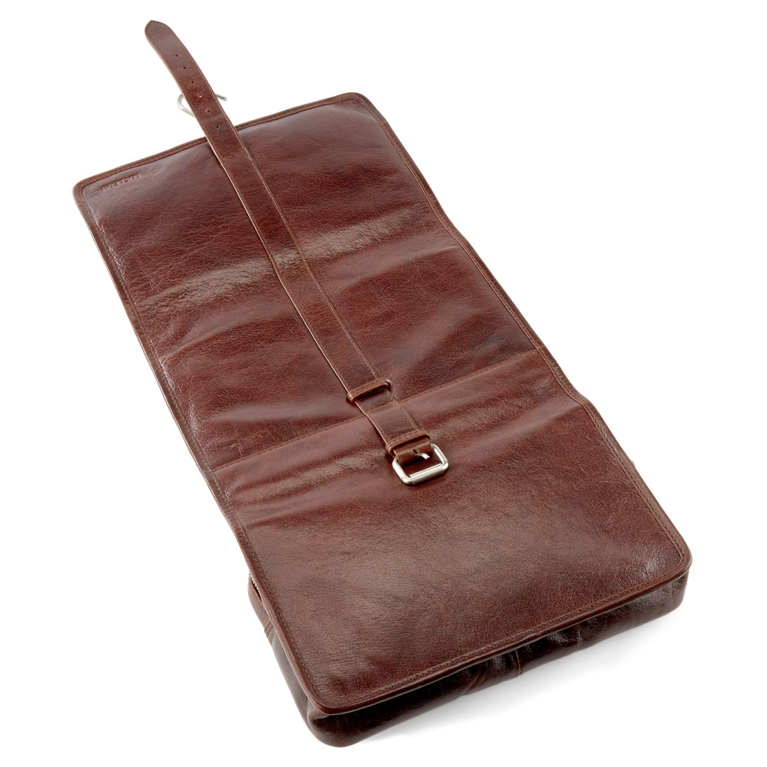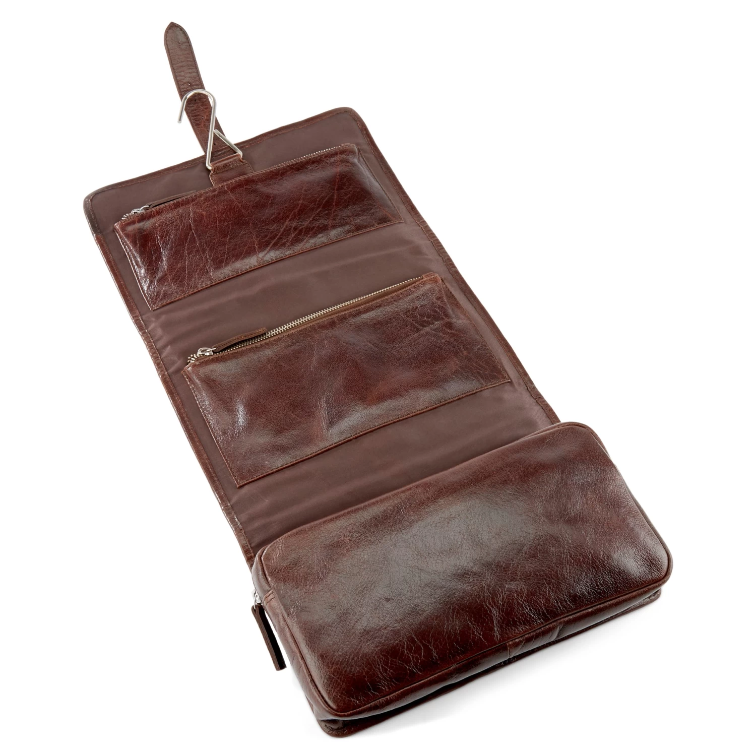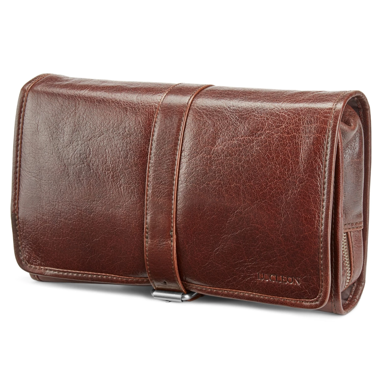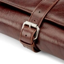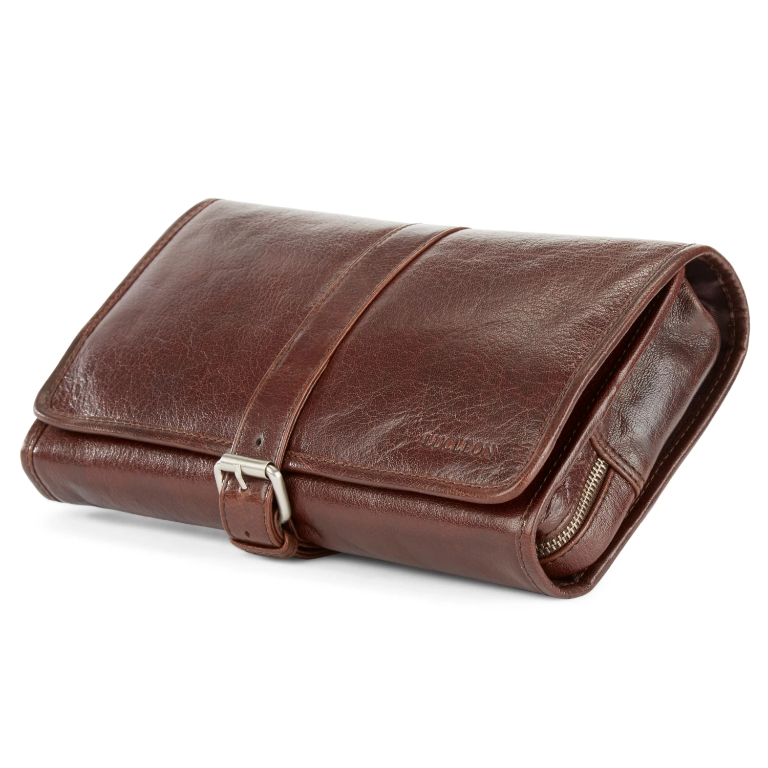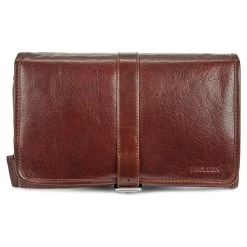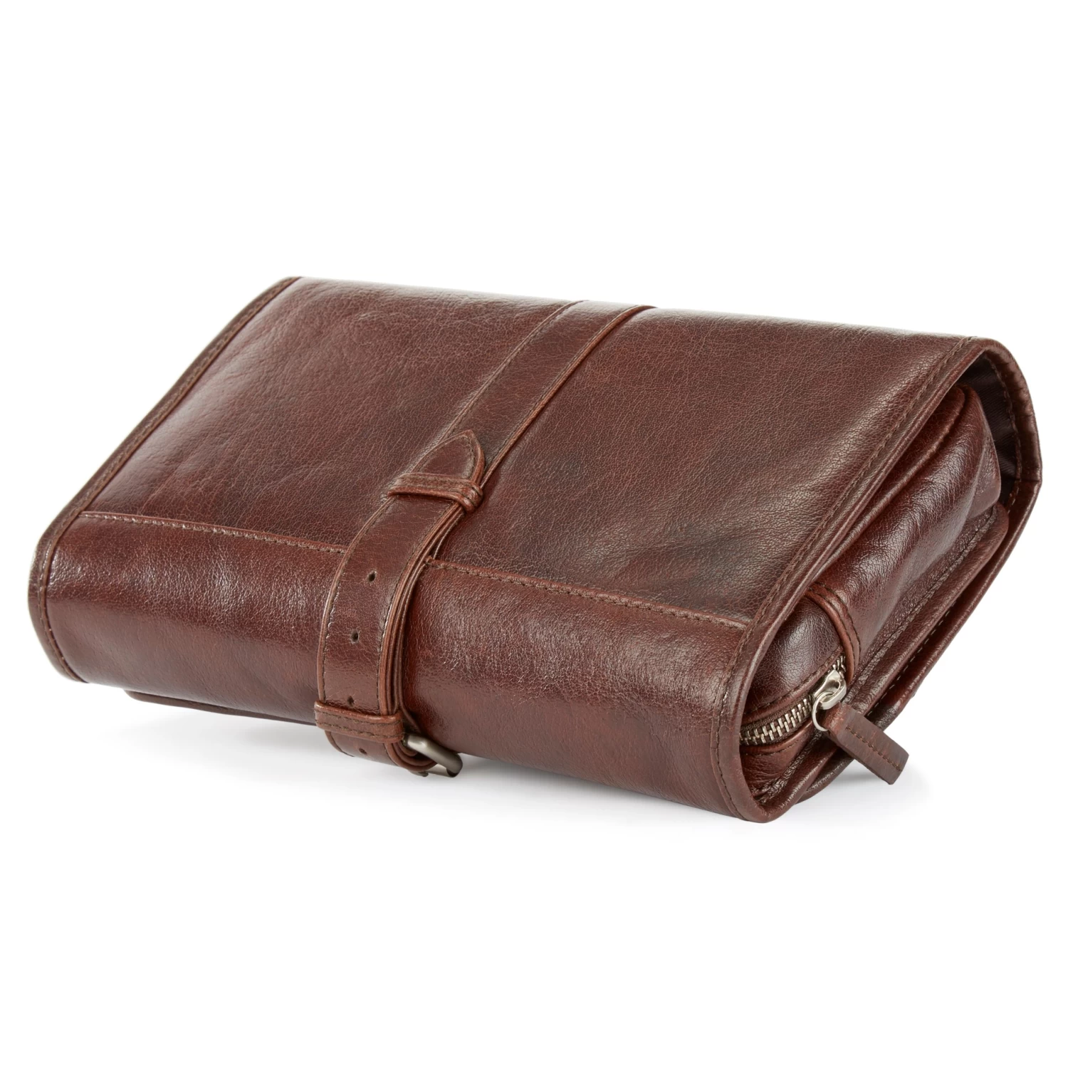 Invest in a quality leather wash bag such as this one and enjoy it for a lifetime. Exterior ages beautifully with wear and tear. Secures with a strap and buckle mechanism.