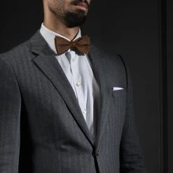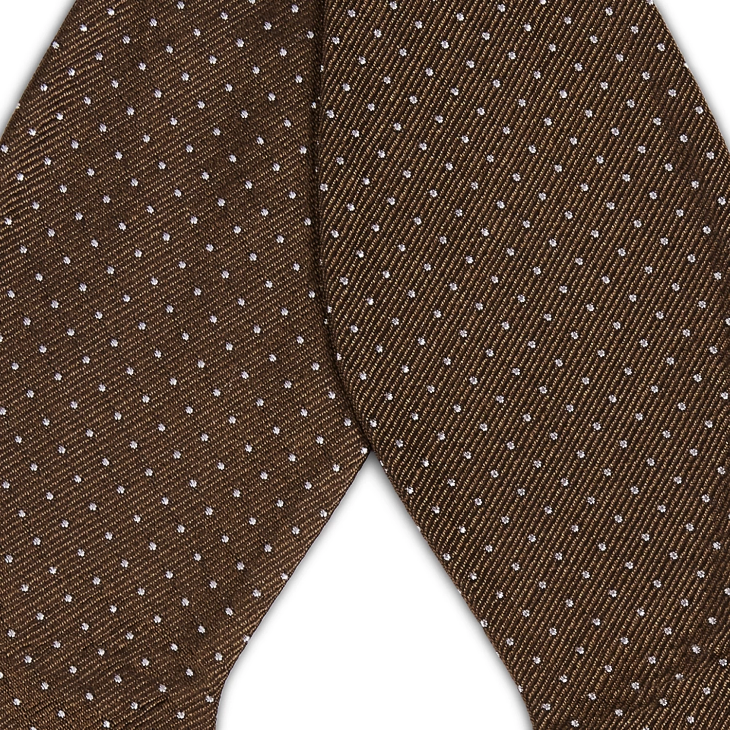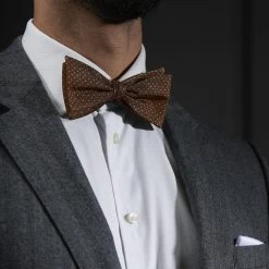 This refined brown bow tie comes in a rich full-toned hue that contrasts beautifully with its fine white polka dot motif.