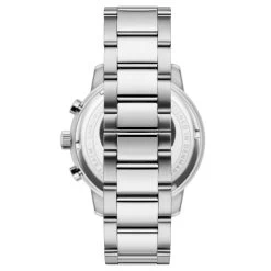 Reliable Miyota chronograph movement beats at the core of this men’s watch. Push the 2 o’clock button to start/stop the chronograph second hand and the minute and milliseconds subdials at 9 and 3. At 6 o’clock lies the normal seconds subdial, with an angled date window between 4 and 5.