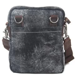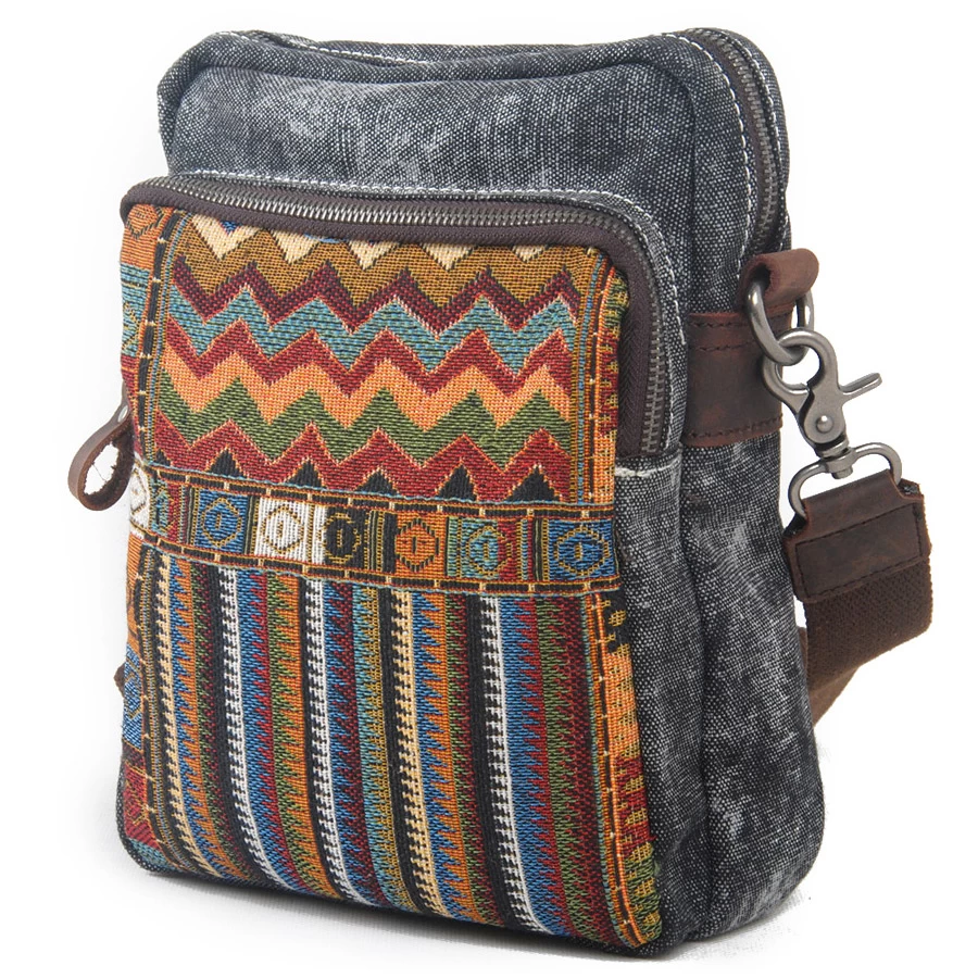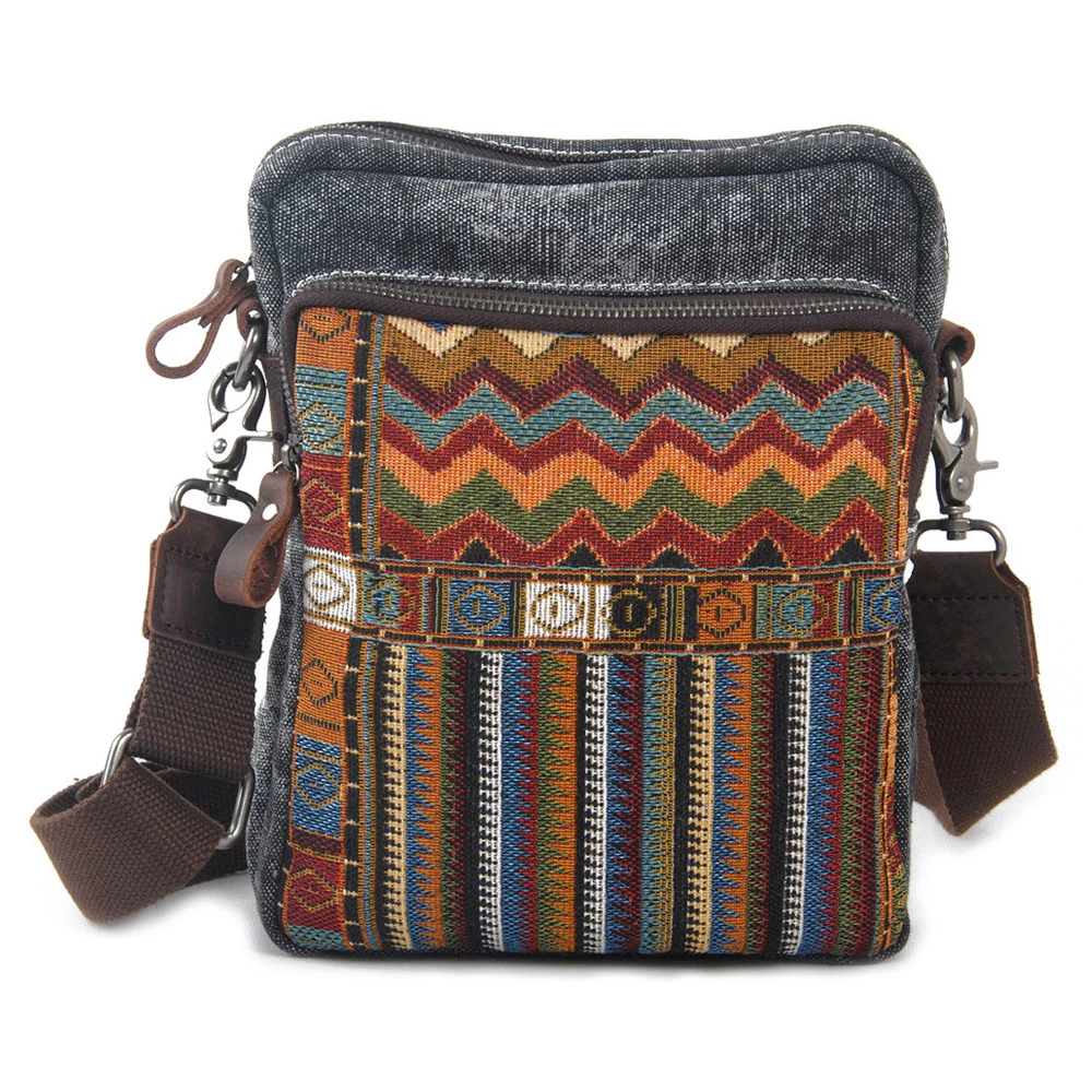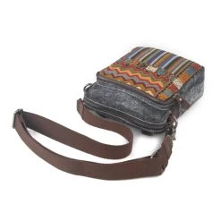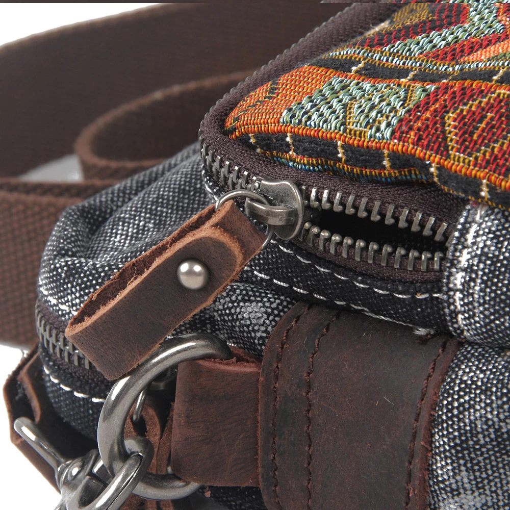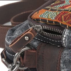 Durable canvas with genuine leather details. The bag’s main compartment closes with a single zipper. Inside has a zippered compartment and 2 wall pockets, along with a zipped pocket. There’s another smaller zipper pocket in the front featuring a multi-colored zigzag pattern. Canvas carrying strap is fully adjustable.