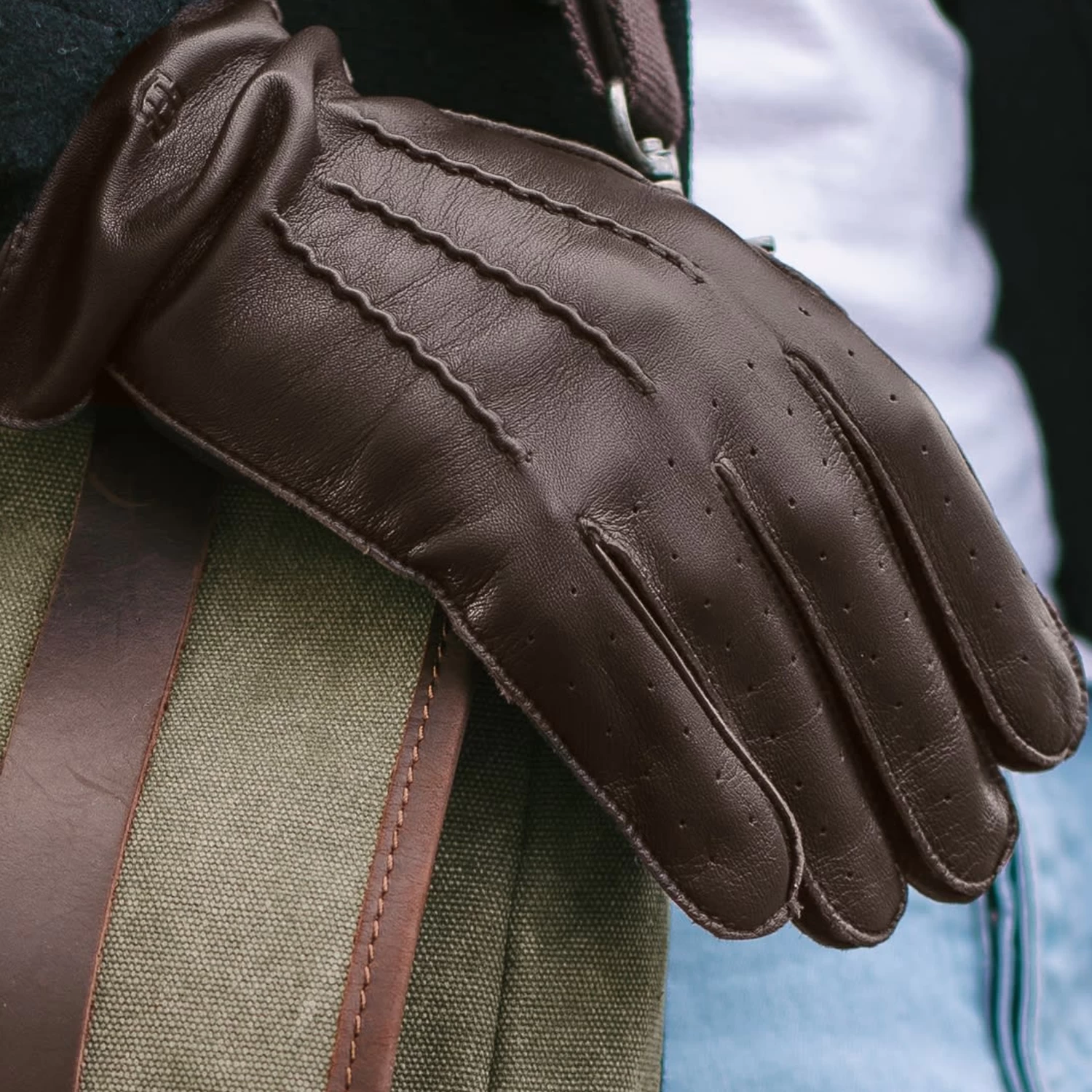 Keep your hands snug, but not sweaty, in these beautiful leather gloves for men. Crafted from soft, finely perforated sheepskin leather that allows your fingers to breathe, with a warm fleece lining that keeps them nice and toasty.