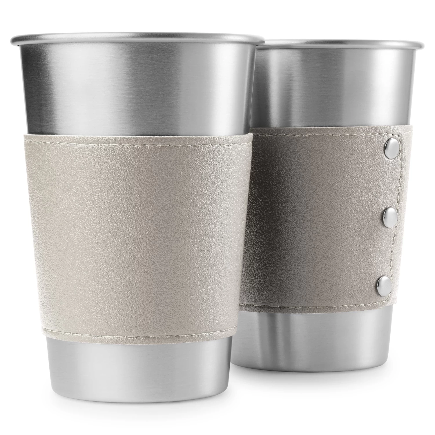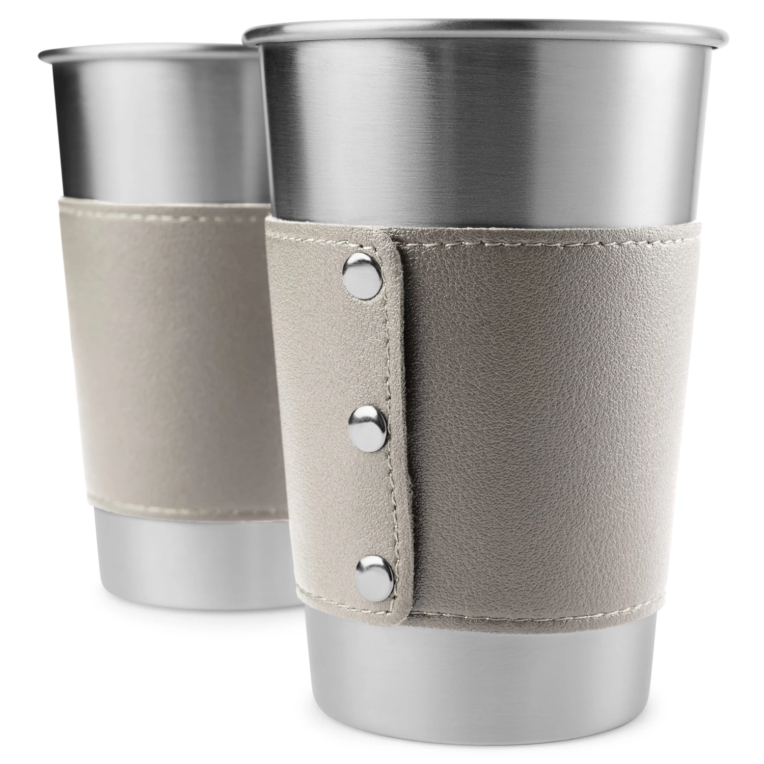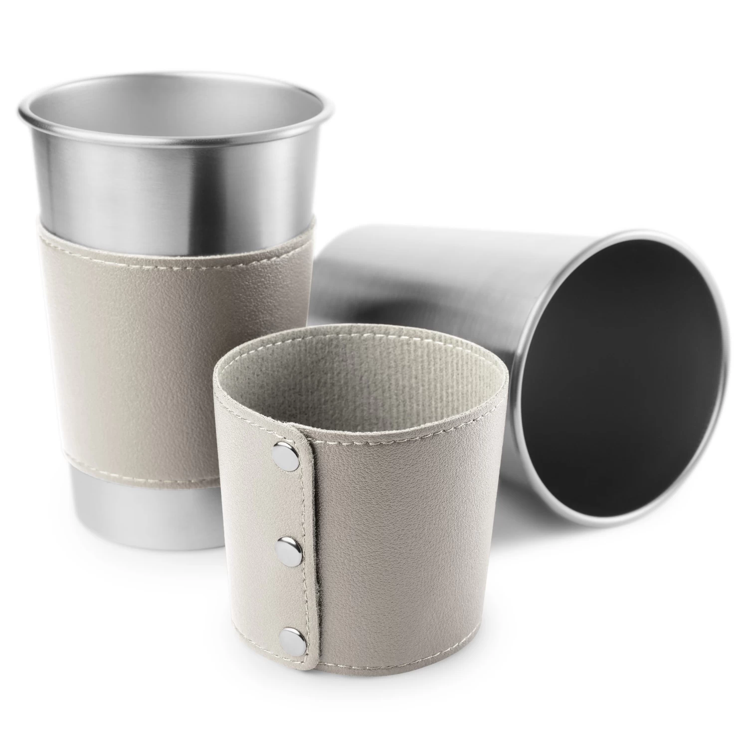 Clad in handsome grey leather, this stainless steel vessel is a study in suave style.