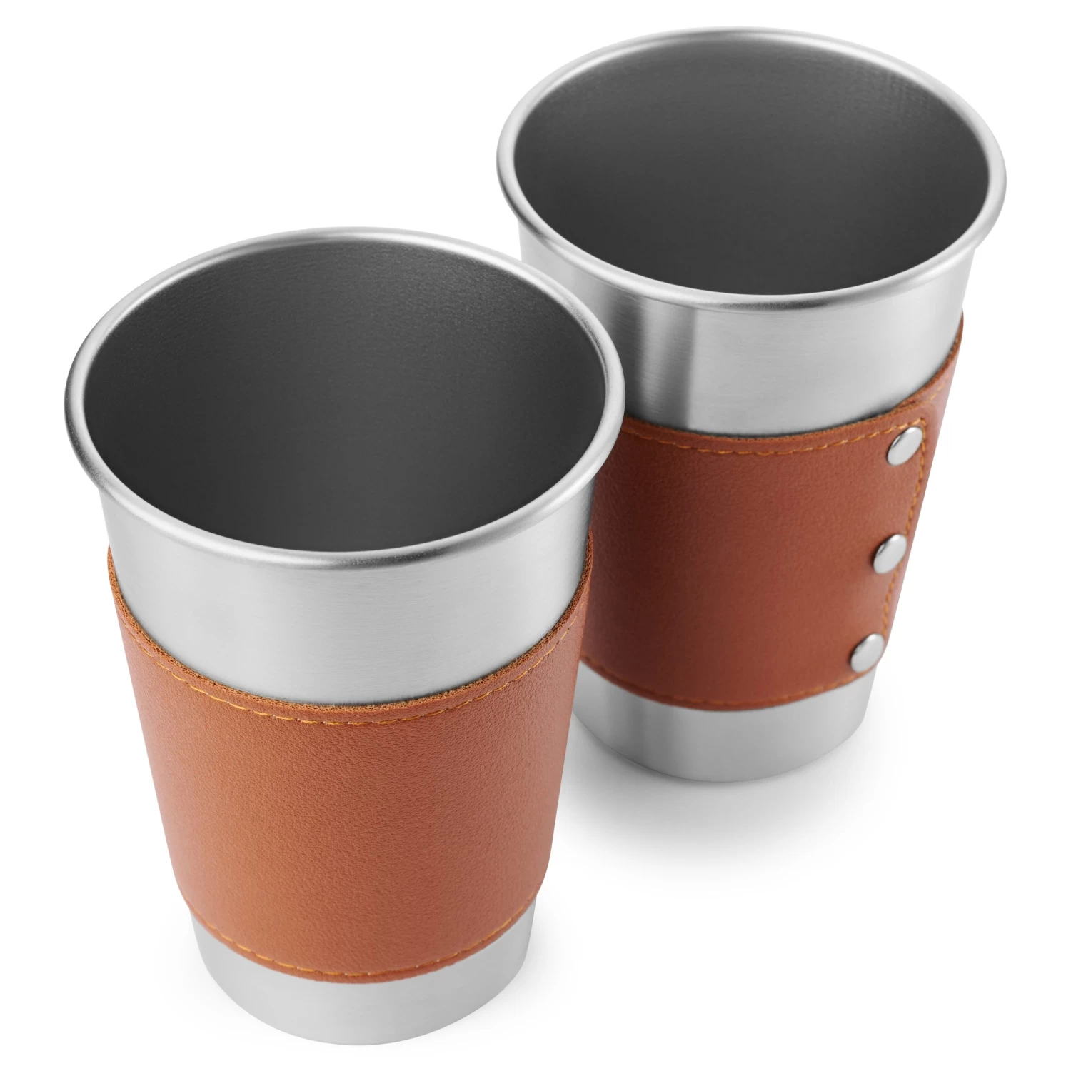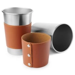 With its brushed stainless steel body, this glass is bedecked in a handsome brown leather cover that’s as rugged as it is refined.
