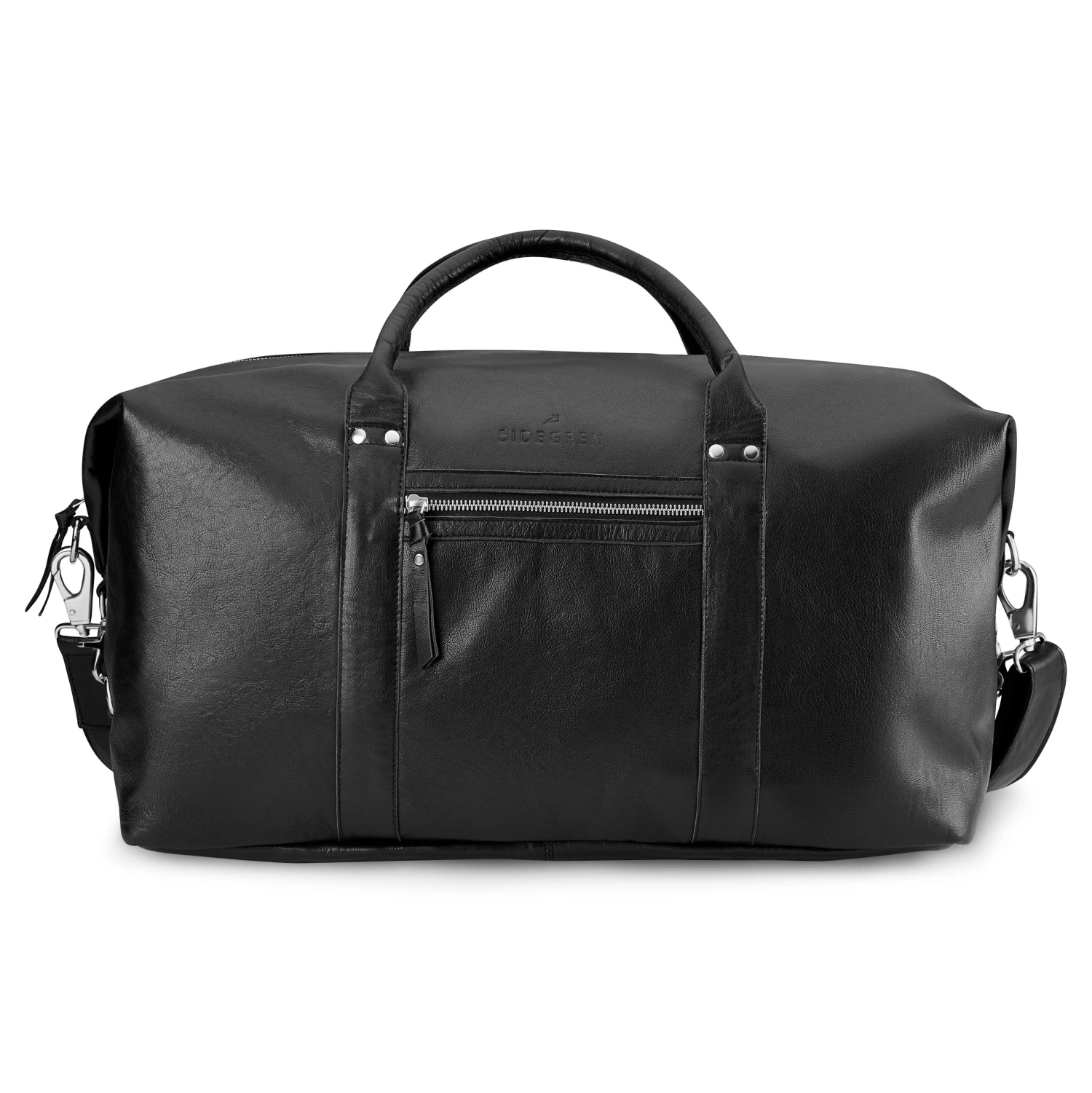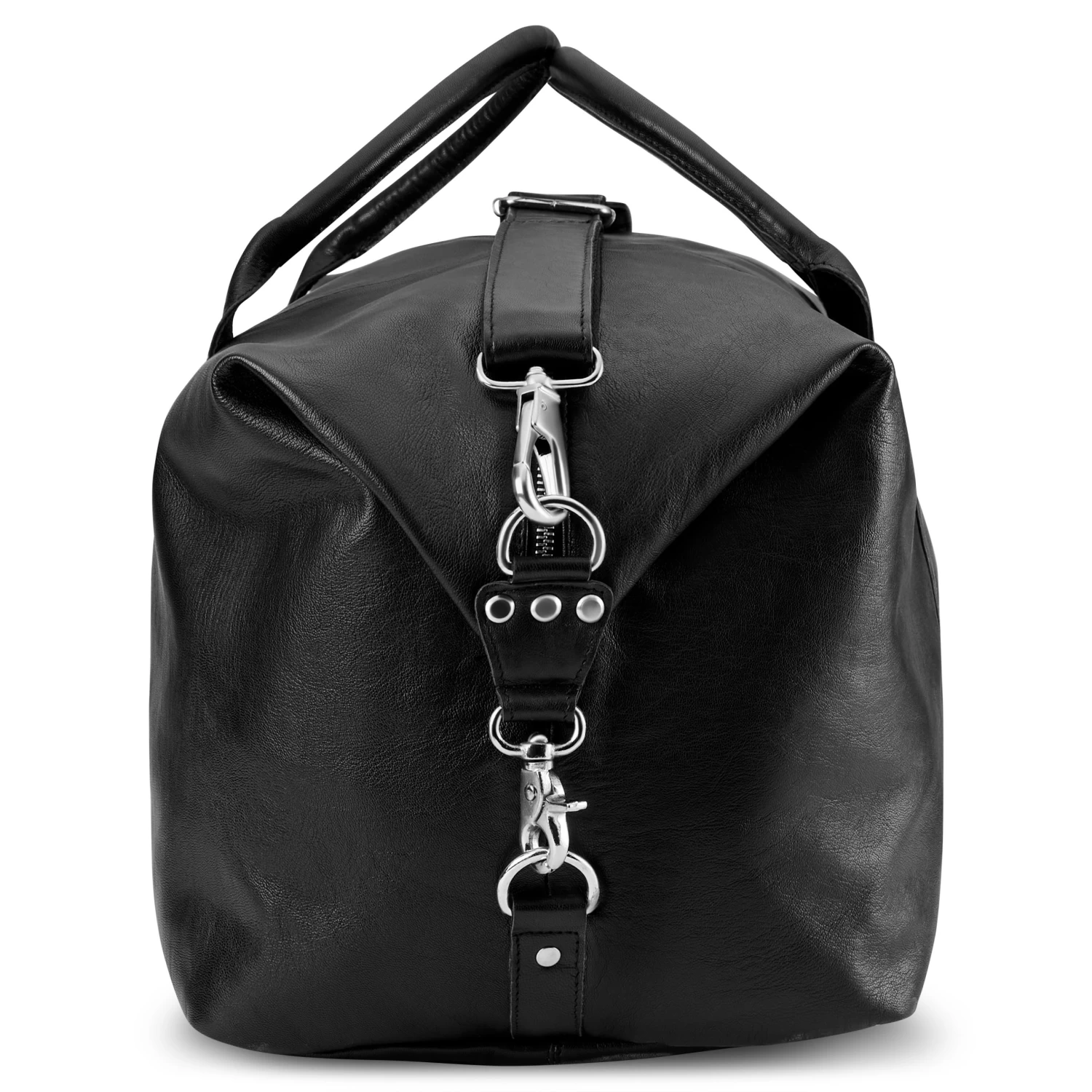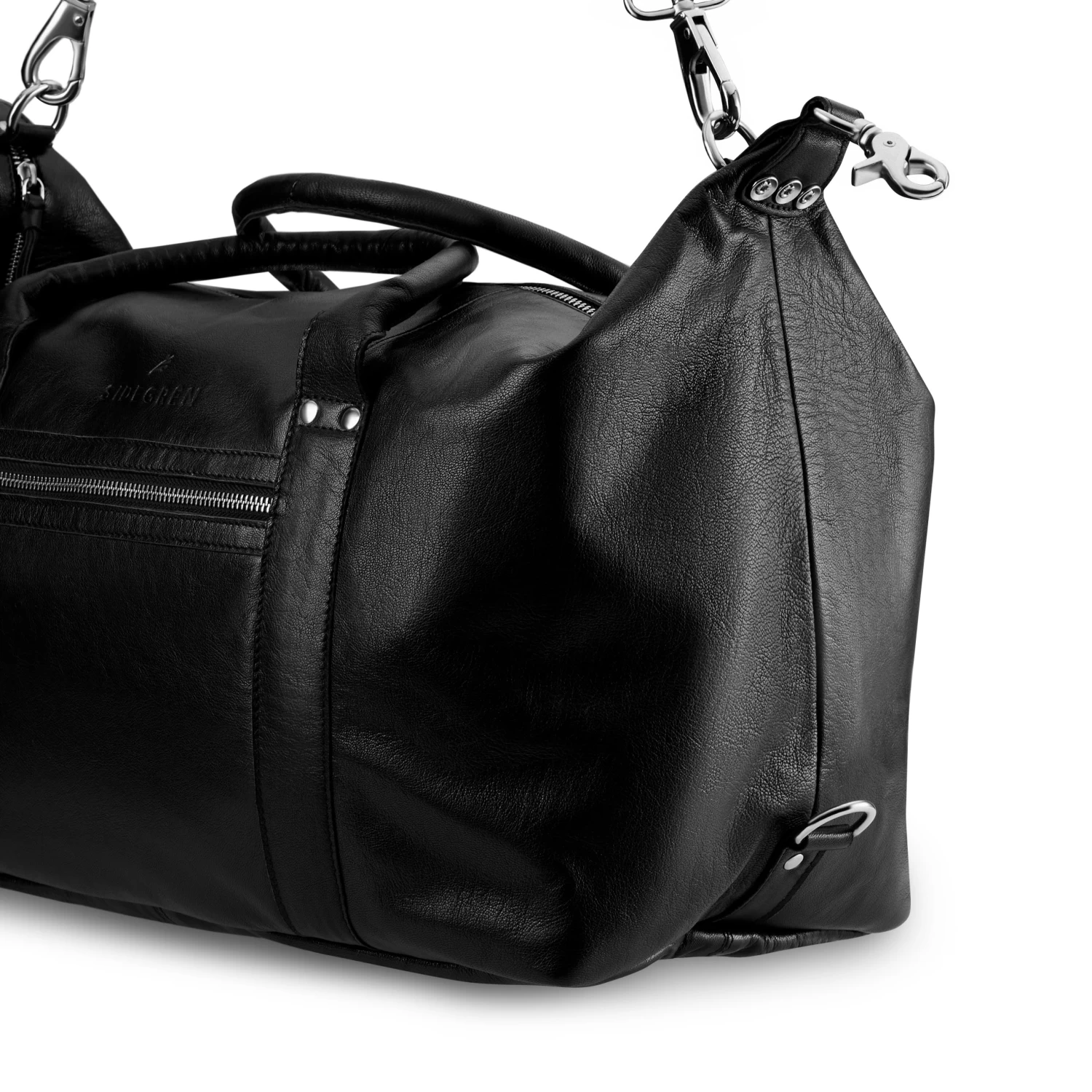 Travel in luxury with this black full-grain goat leather travel bag. Boasting vegetable-tanned leather that’s durably robust yet tantalisingly soft, it ages with timeless charm. Its water-repellent lining and YKK zippers safeguard your essentials. An oversized external zip pocket pairs with an internal compartment, featuring another zipped pocket for easy organisation. Two hook loops customise the carry, and five metal studs shield the leather during travel.