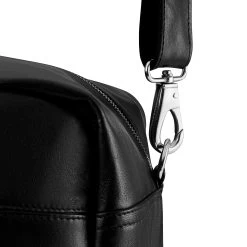 The roadworthy elegance of our large black full-grain goat leather travel bag melds durability and softness. This vegetable-tanned beauty ages with grace. The water-repellent lining and secure YKK zippers guard your essentials, with ample organization in an outer zip pocket and inner compartment. The ingenious side strap readily attaches extras, while five metal studs offer rugged protection.