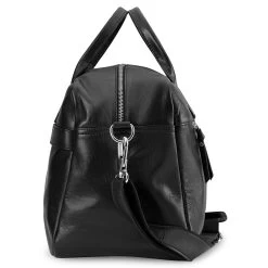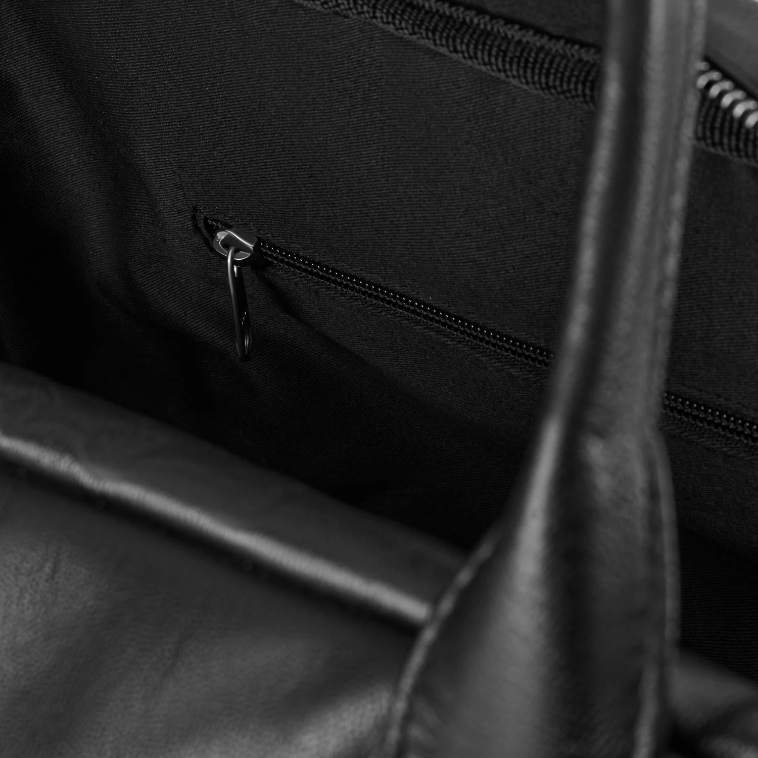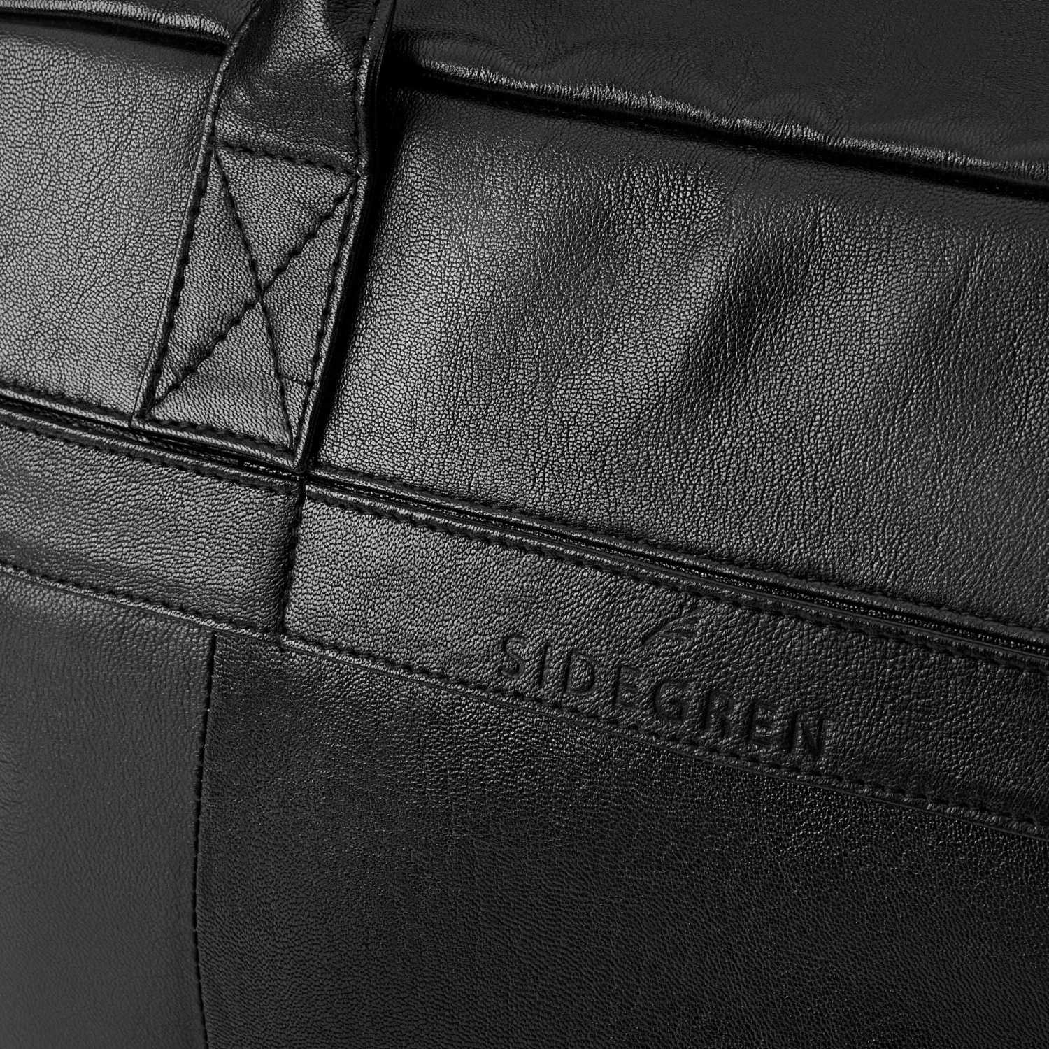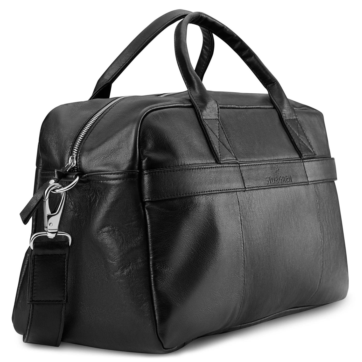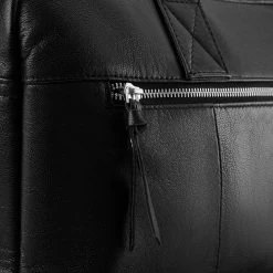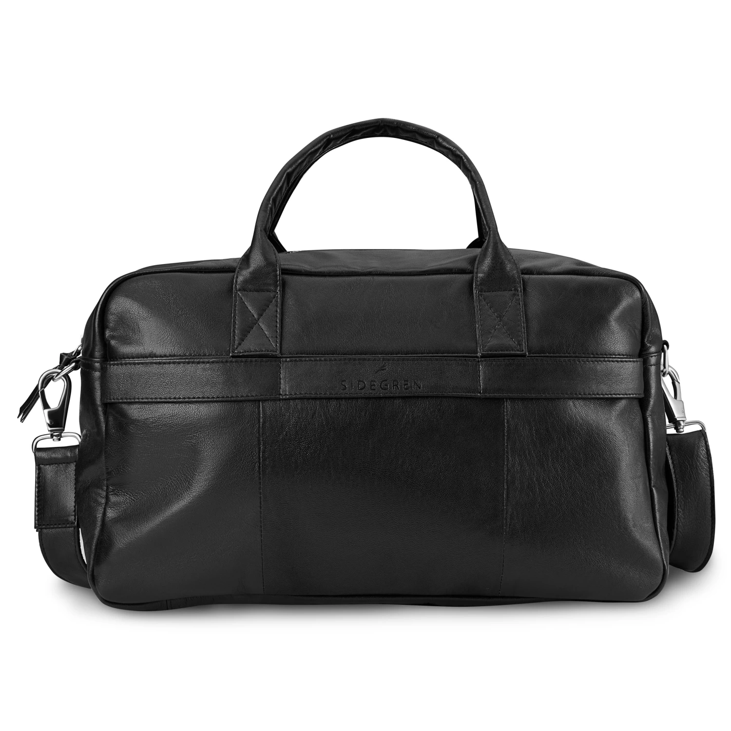 Our slim black goat leather weekender combines rugged durability with a suave smoothness. This vegetable-tanned marvel ages with refined elegance. It boasts a handy external zip pocket for quick access, while the sleek inner compartment, paired with an additional zip pocket, provides classy organisation. Five metal studs guard the base, reinforcing the high-grade leather against the wear of the journey .A side strap runs along the side of the bag to easily attach extras, like hanging your umbrella.