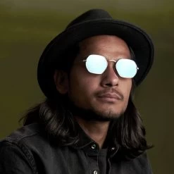 Get your groove on with these neat angular men’s sunglasses. Gold-toned metal frames and blue lenses complete the look. Full UVA/UVB protection provided.