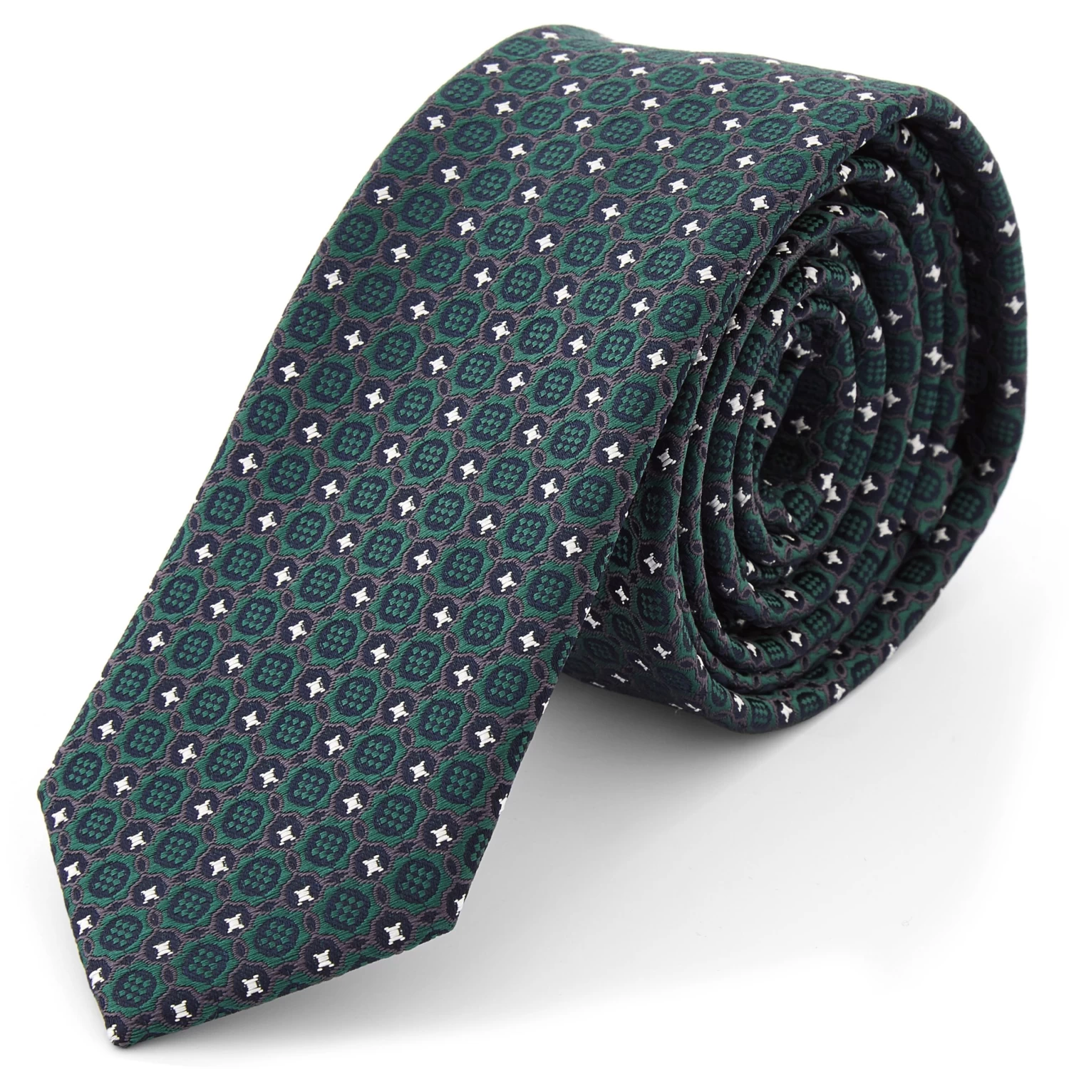 A classic tie featuring an elaborate print in hues of green, white, purple, and blue. The rich color scheme and solemn pattern make this neckwear perfect for cold weather ensembles.