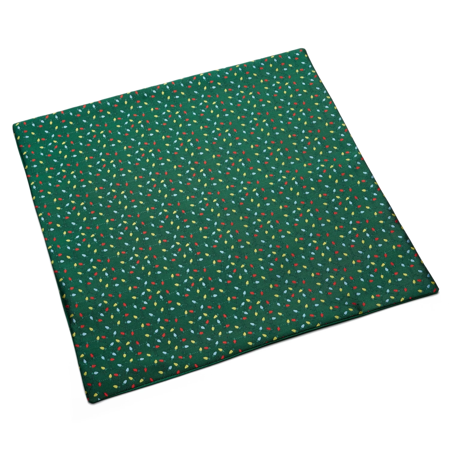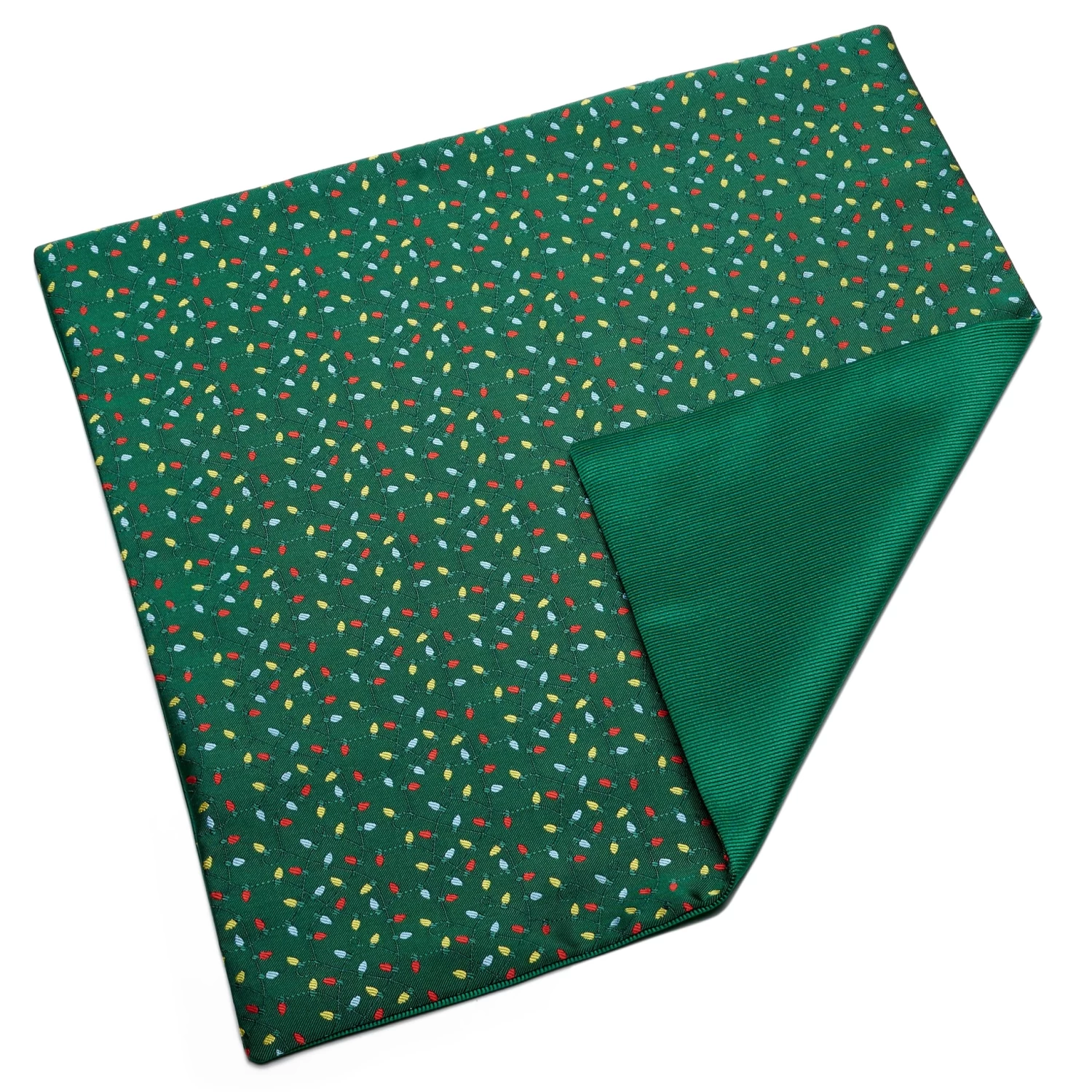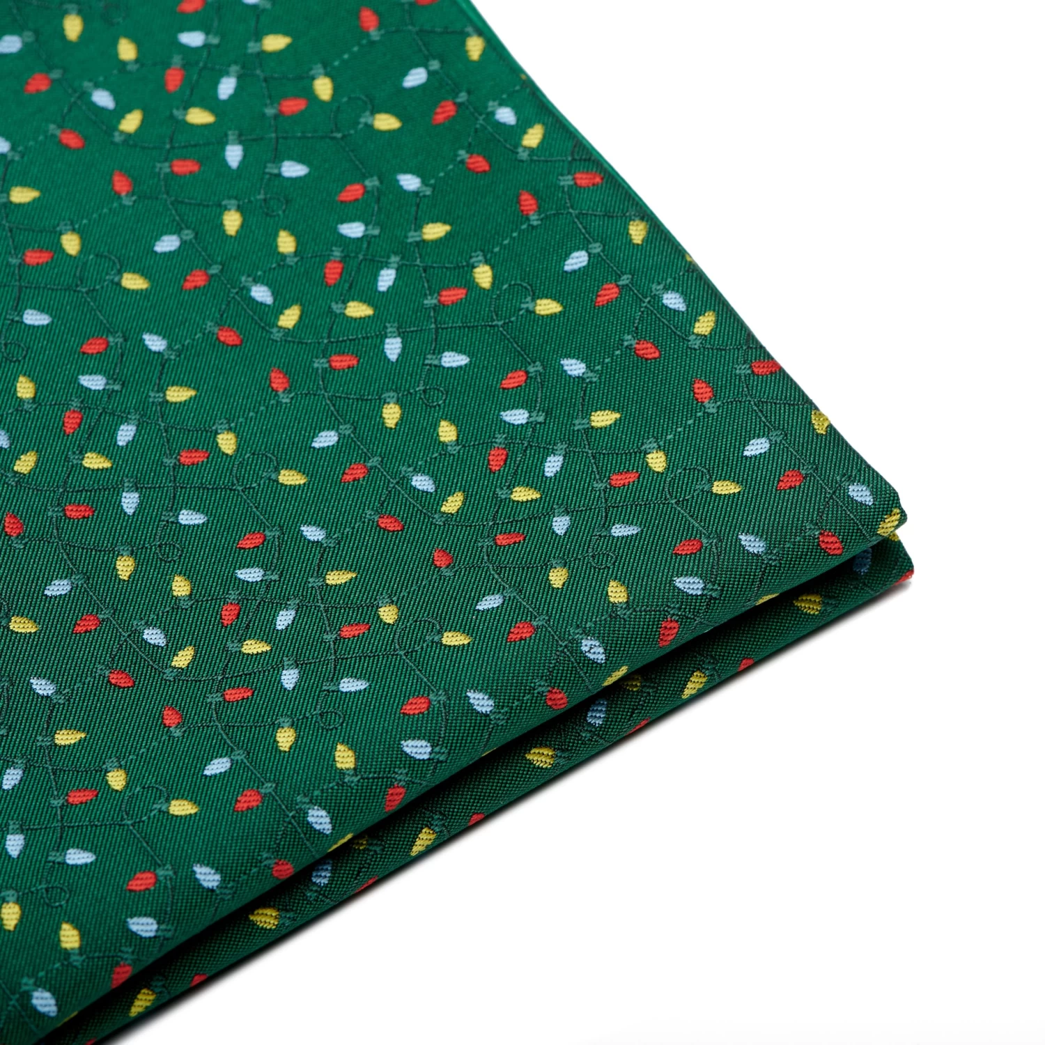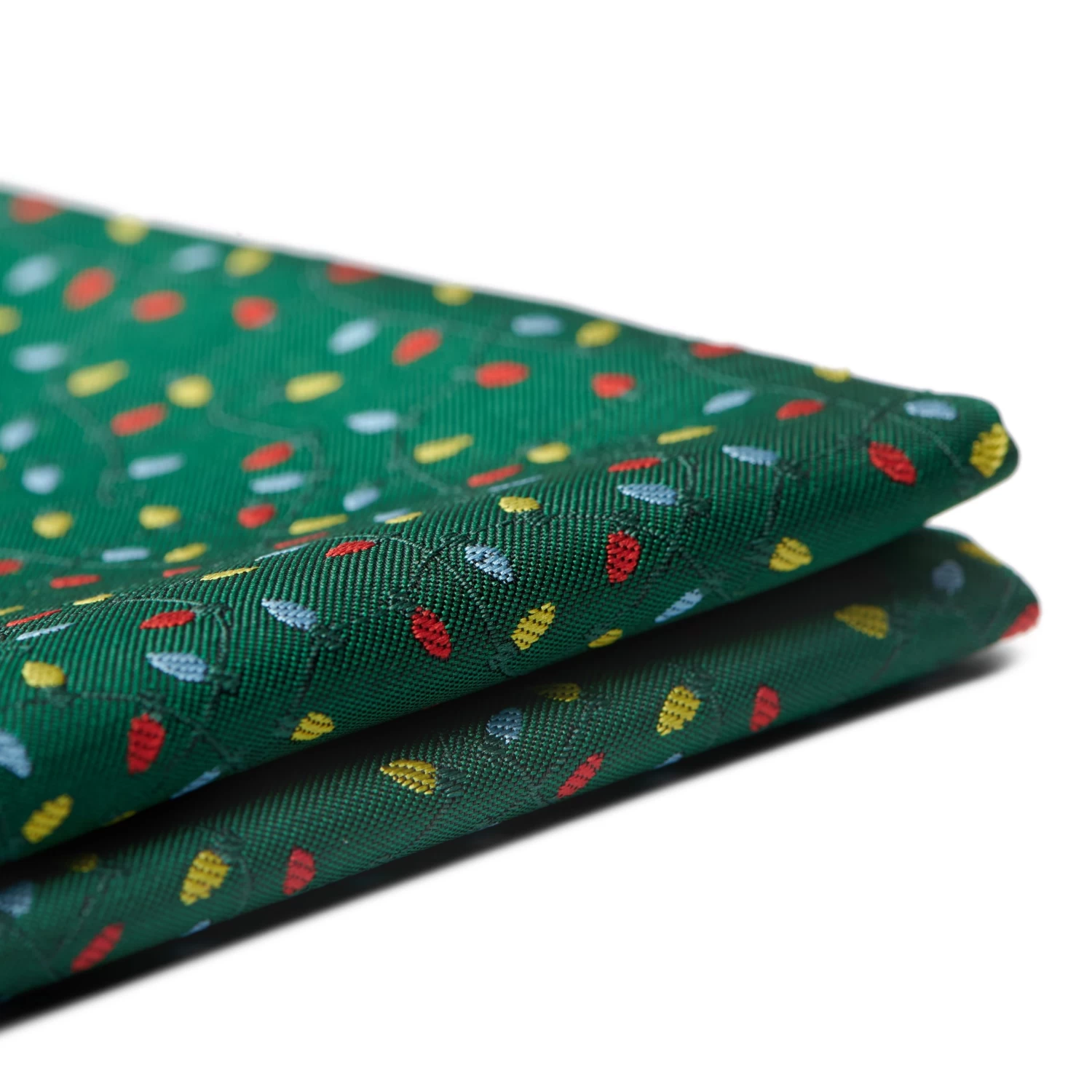 This Christmas pocket square features looping strands of lights atop a green background. And it’s cut from a lightweight polyester that’s easy to fold without bulging out of your pocket.