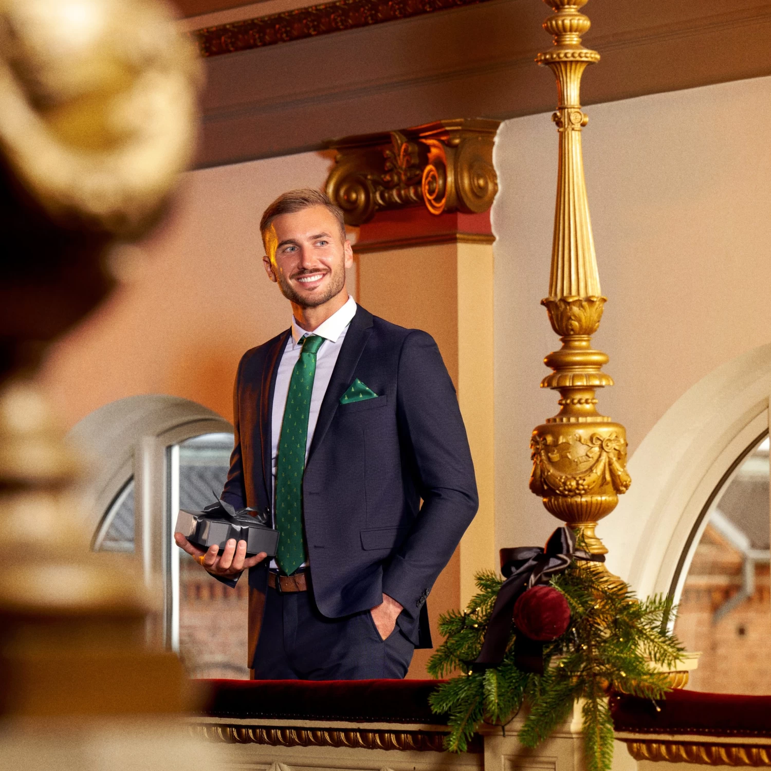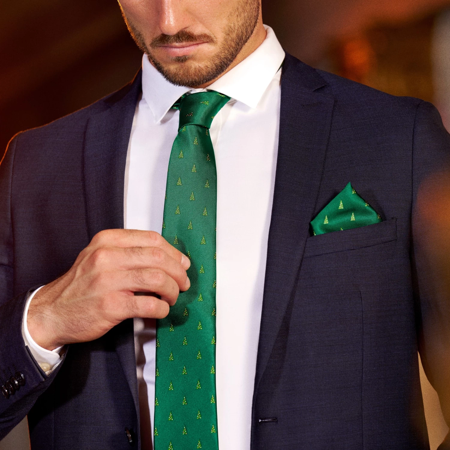 Cut from lightweight fabric that’s easy to tie. Add a gold-tone tie bar for extra holiday magic.