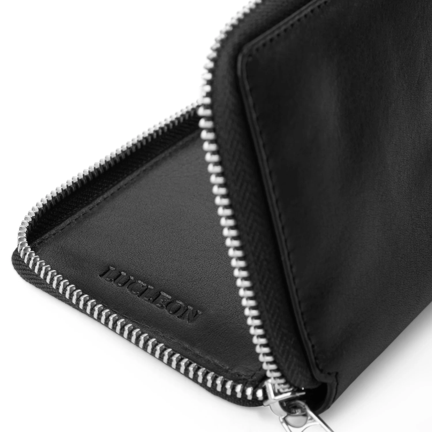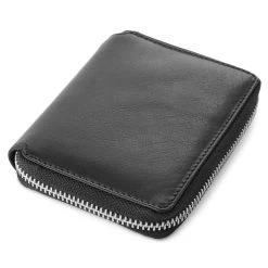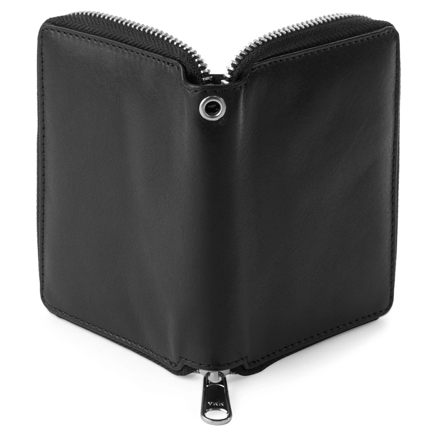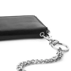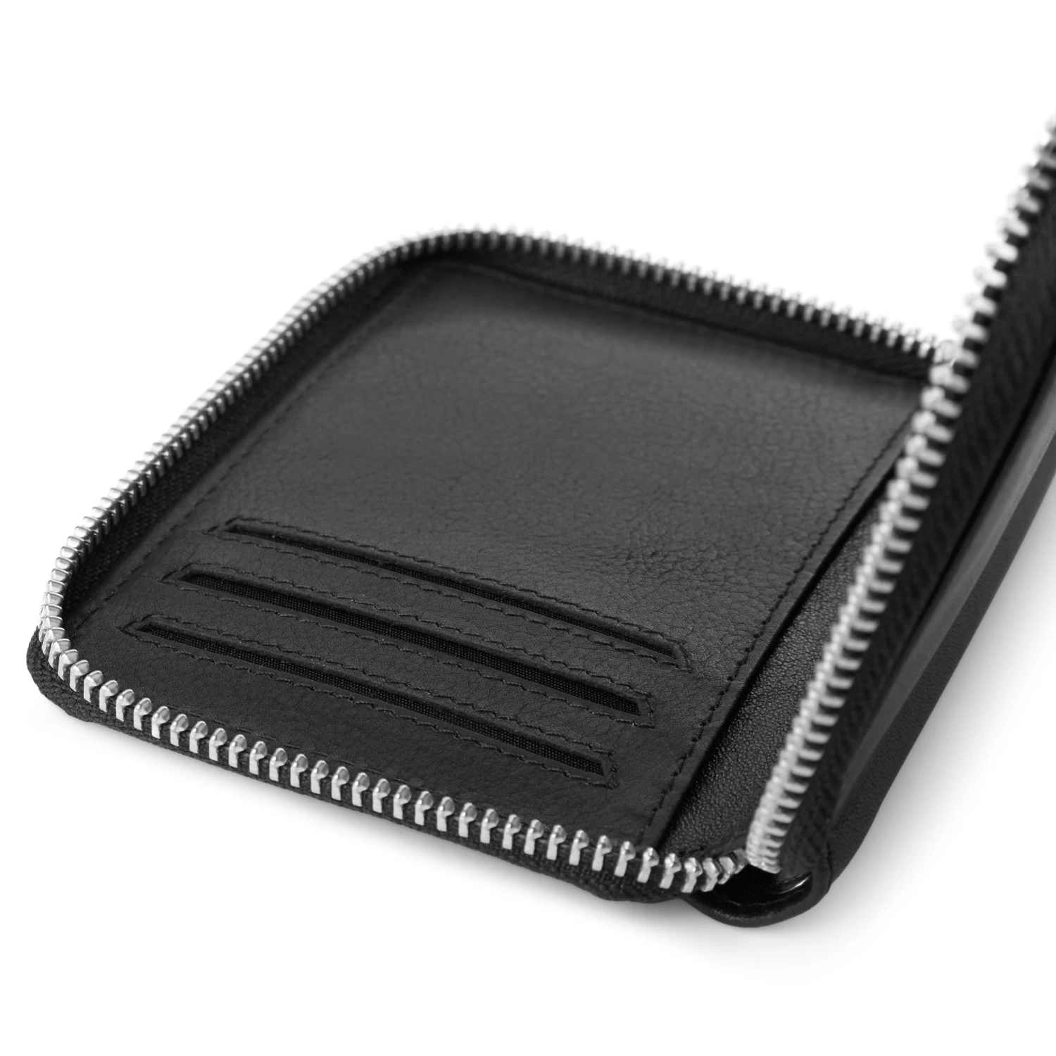Unzip this black leather wallet for men to reveal 6 credit card slots and 2 slip pockets. This streamlined wallet/card holder includes a silver-tone wallet chain to keep it securely connected to your trousers and RFID protection to keep your personal data safe.