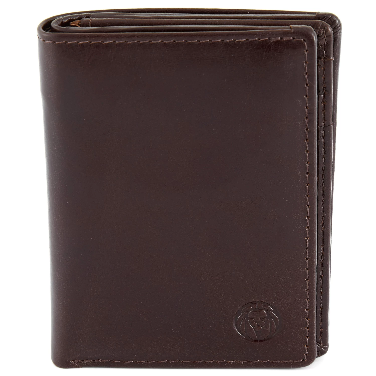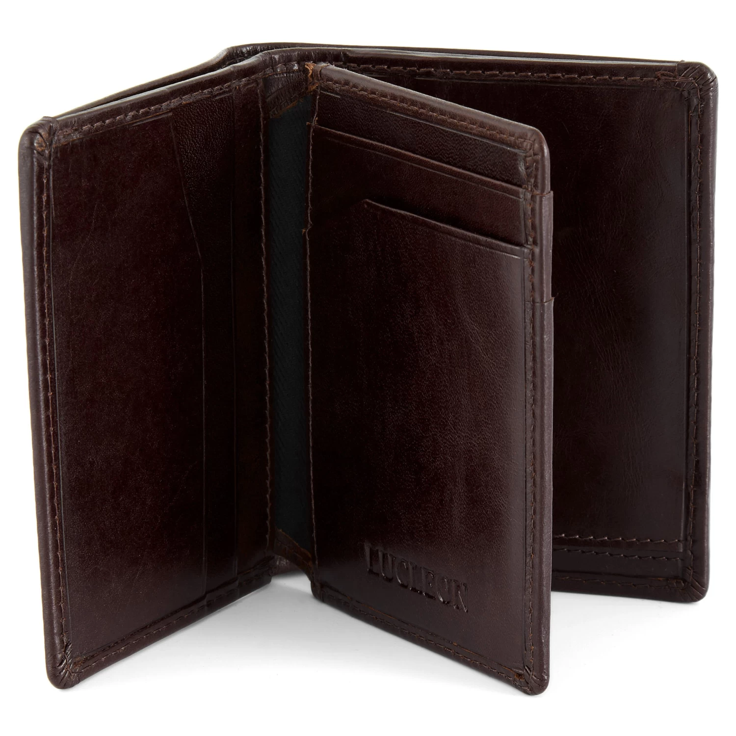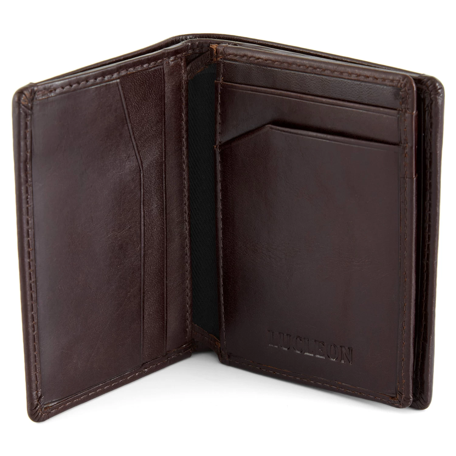 This genuine leather dark brown wallet features a slim, minimalist design. Its interior holds 2 bill compartments, a zipped coin pocket, and 7 card slots. Each card slot can easily hold 2 cards.