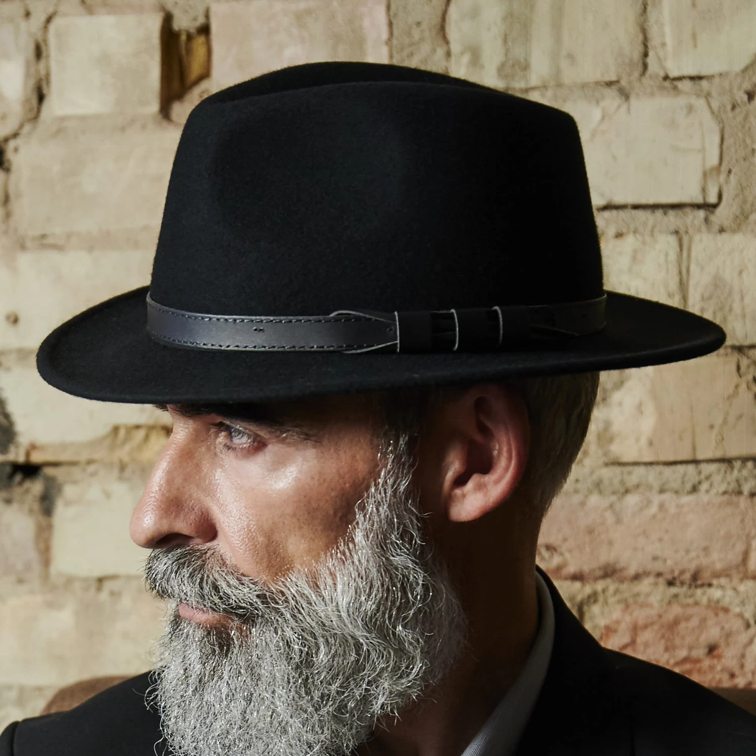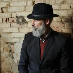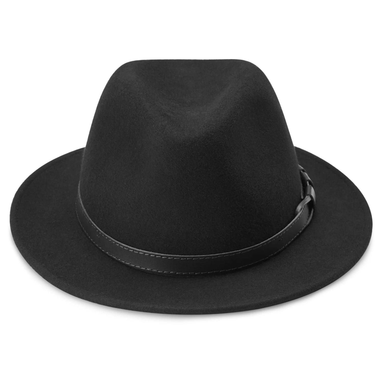 This black fedora hat for men is expertly crafted in Italy and features a flat brim and black, vegan leather band.