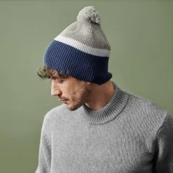 Designed with navy blue, off-white and grey. Constructed in a high-quality blend of materials that includes soft merino wool.