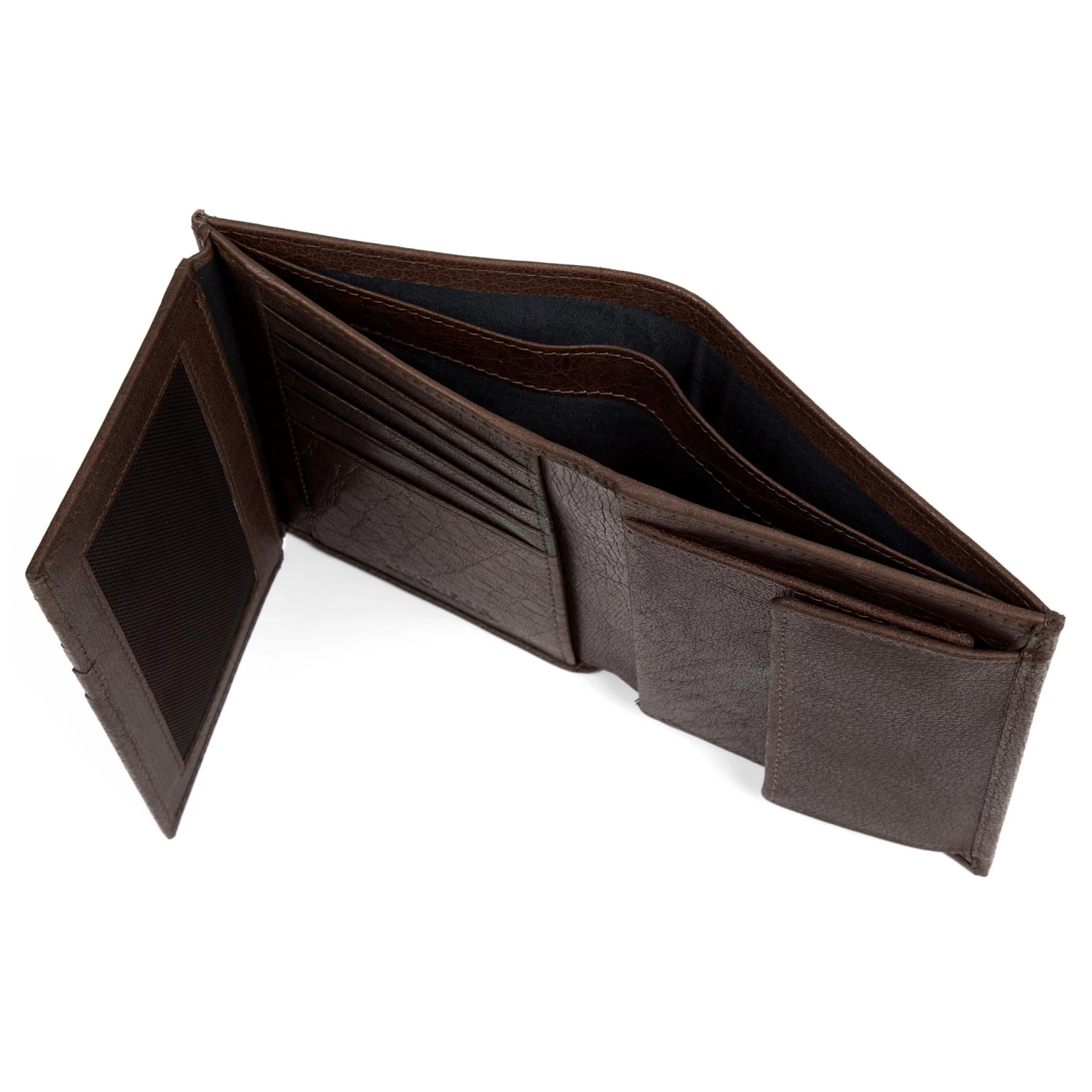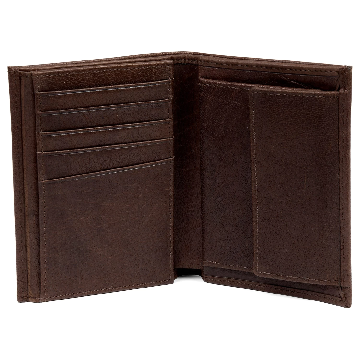 Features 10 2-card slots, an ID window, a divided section for bills, and a coin pocket with snap closure.