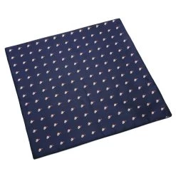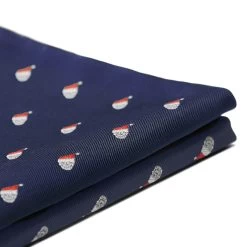 Crafted from lightweight polyester, the navy blue Christmas pocket square features floating skulls with Santa hats. It’s merry and bright with a dark twist.