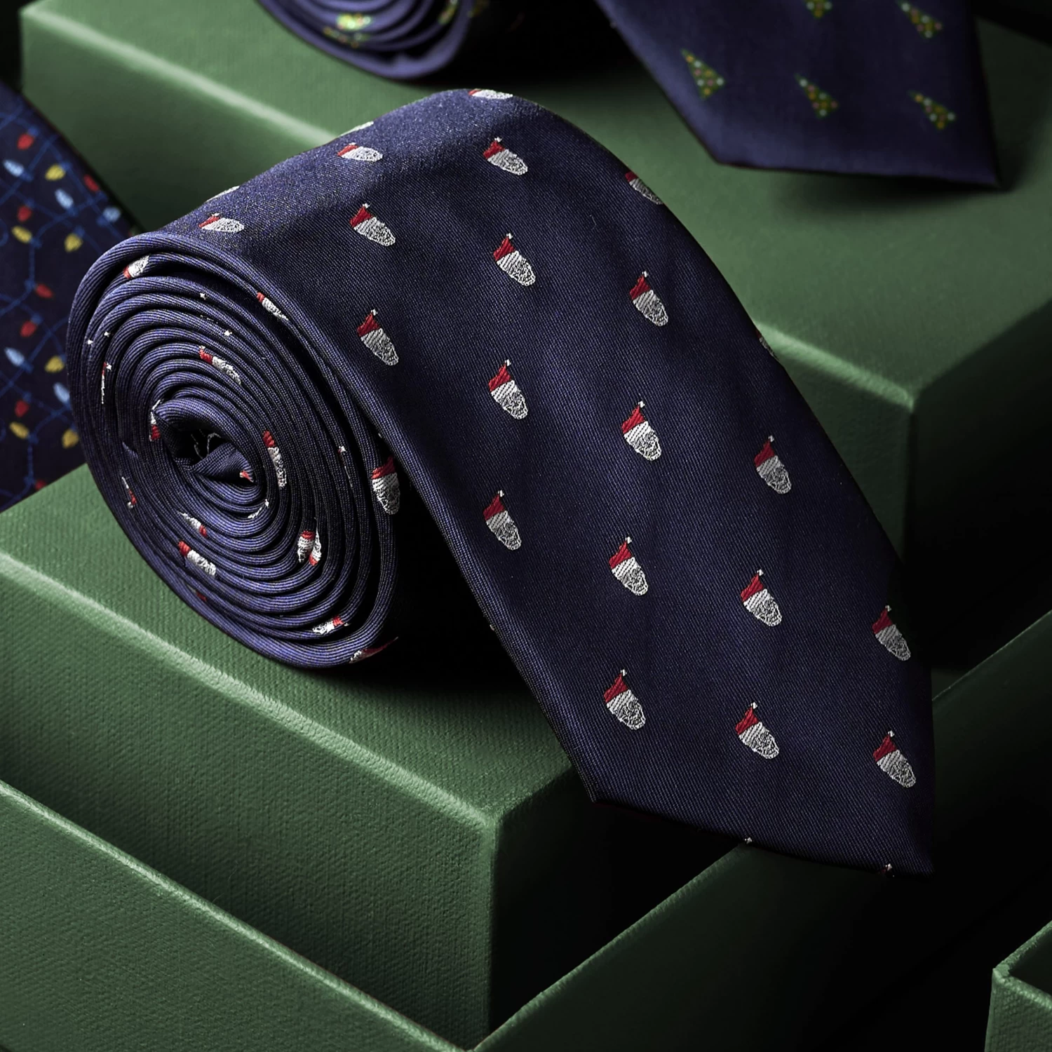 Cut from durable fabric, this navy blue Christmas tie features a host of grinning skulls complete with Santa hats on.