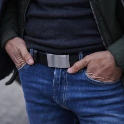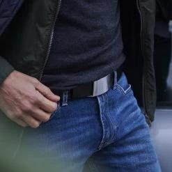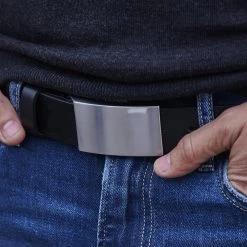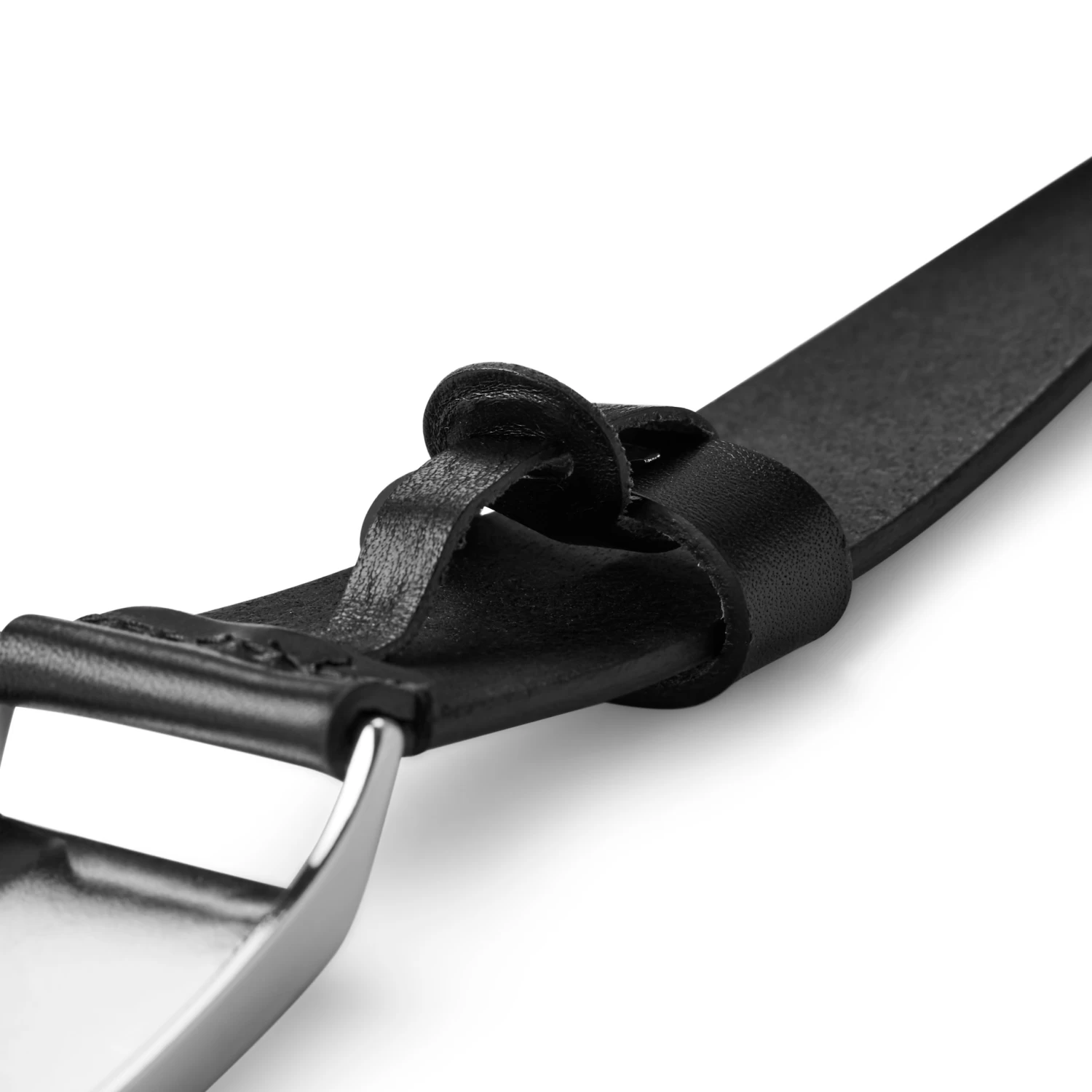 Every man’s closet should have a black leather belt. Designed for both casual and formal occasions, this selection from Fawler offers a stylish touch and will pair well with other silver-tone accessories.