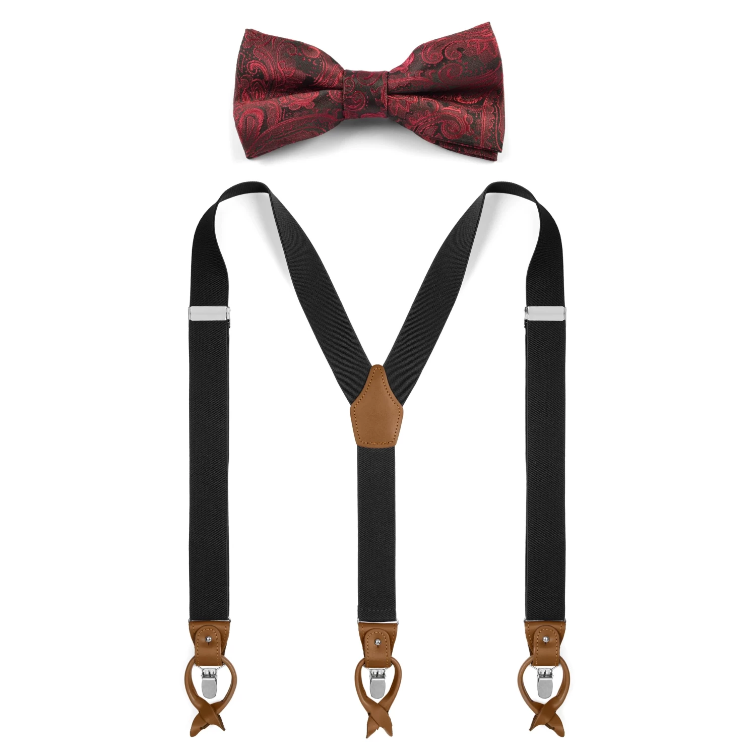 Bring a touch of old-school style to your formal look with this bow tie and braces set. Comes with a pre-tied bow and adjustable strap for comfort, and the flexibility of button or clip fasteners for the braces.