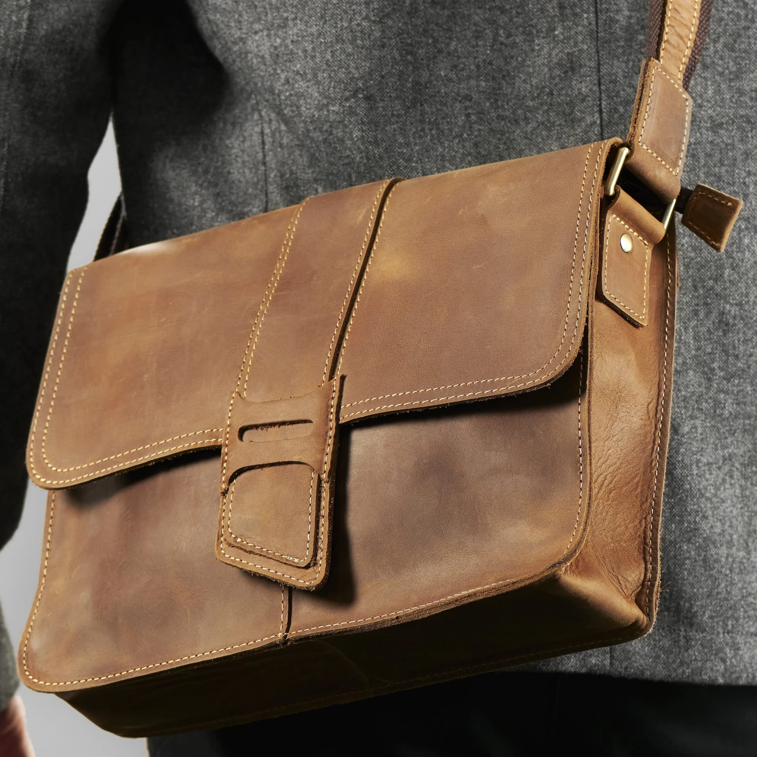 This gorgeous leather bag for men has been aged for a vintage explorer feel. The spacious interior holds everything you need for your day-to-day life.