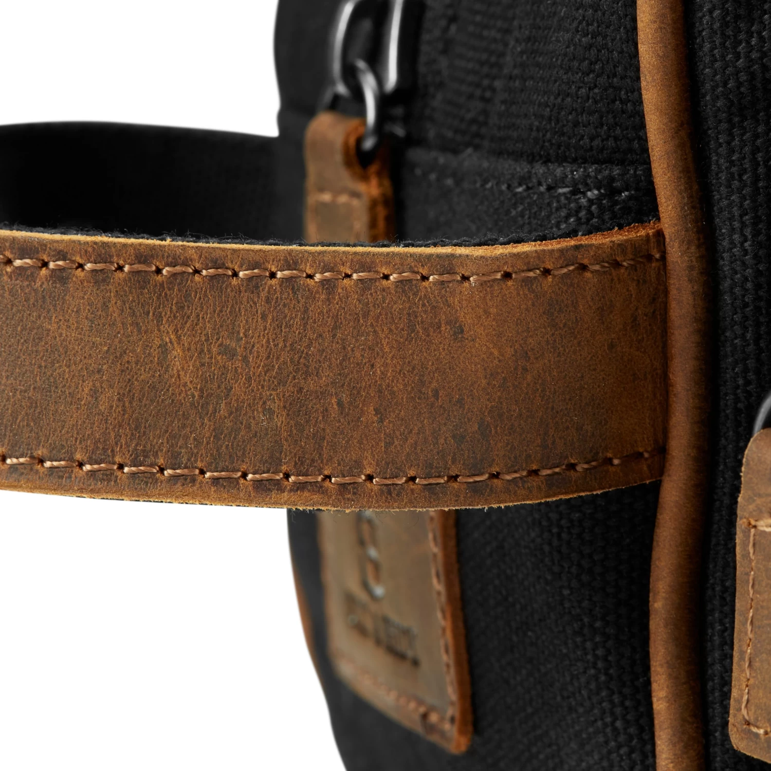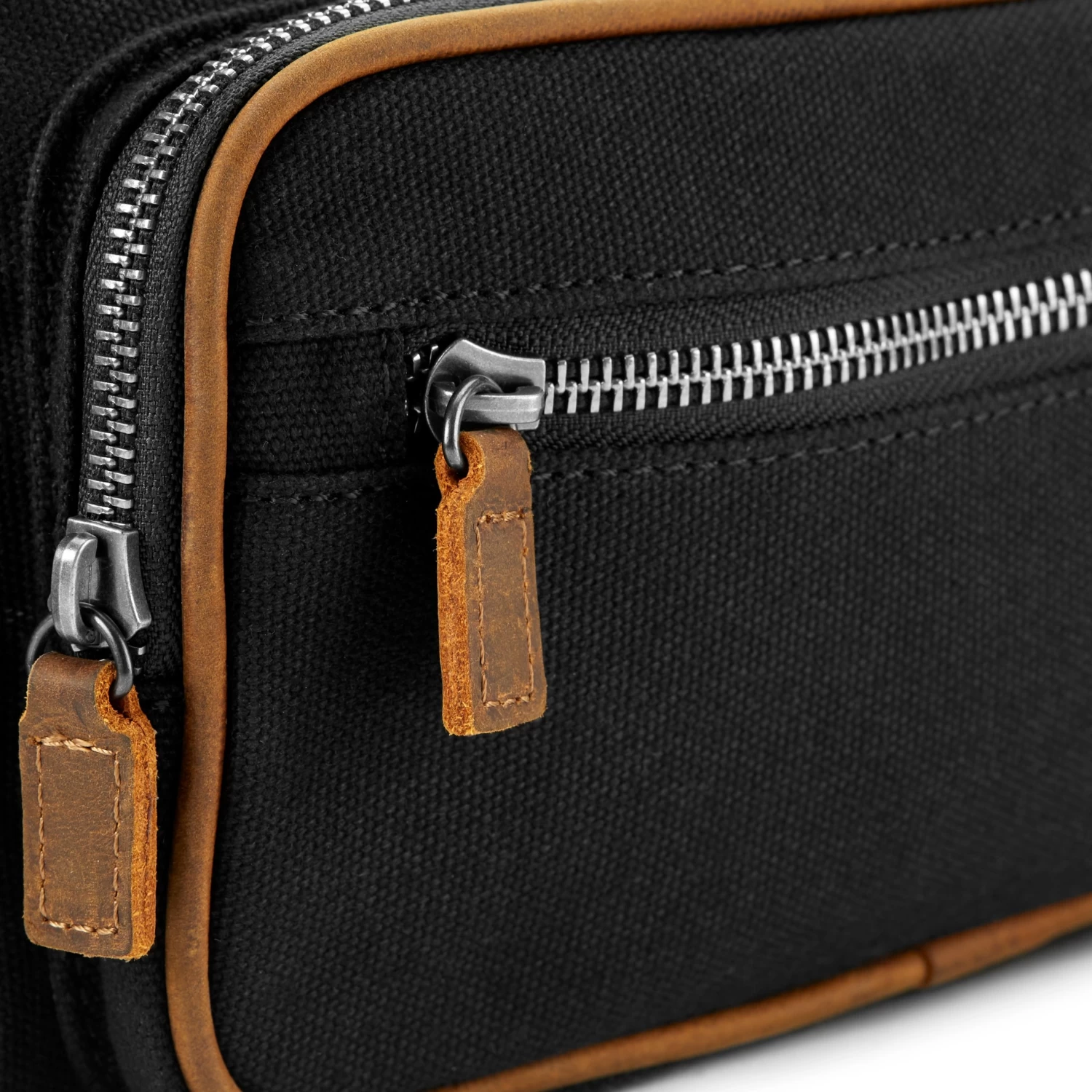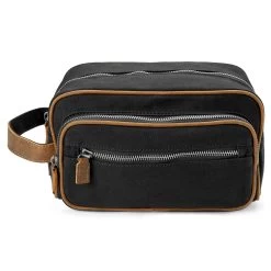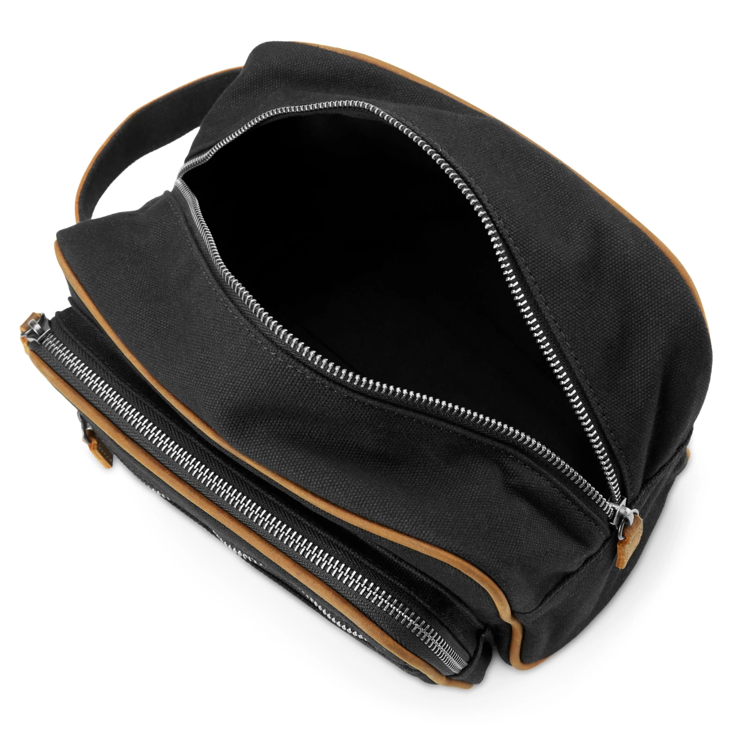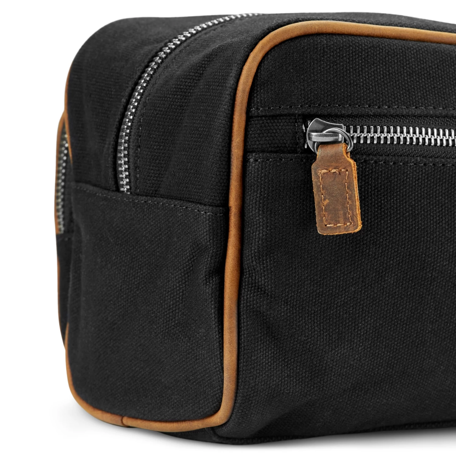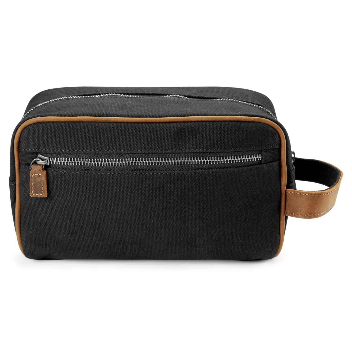 Constructed with sturdy canvas and genuine leather detailing, this toiletry bag provides ample storage for your grooming must-haves. Designed to be used on the road or at home.