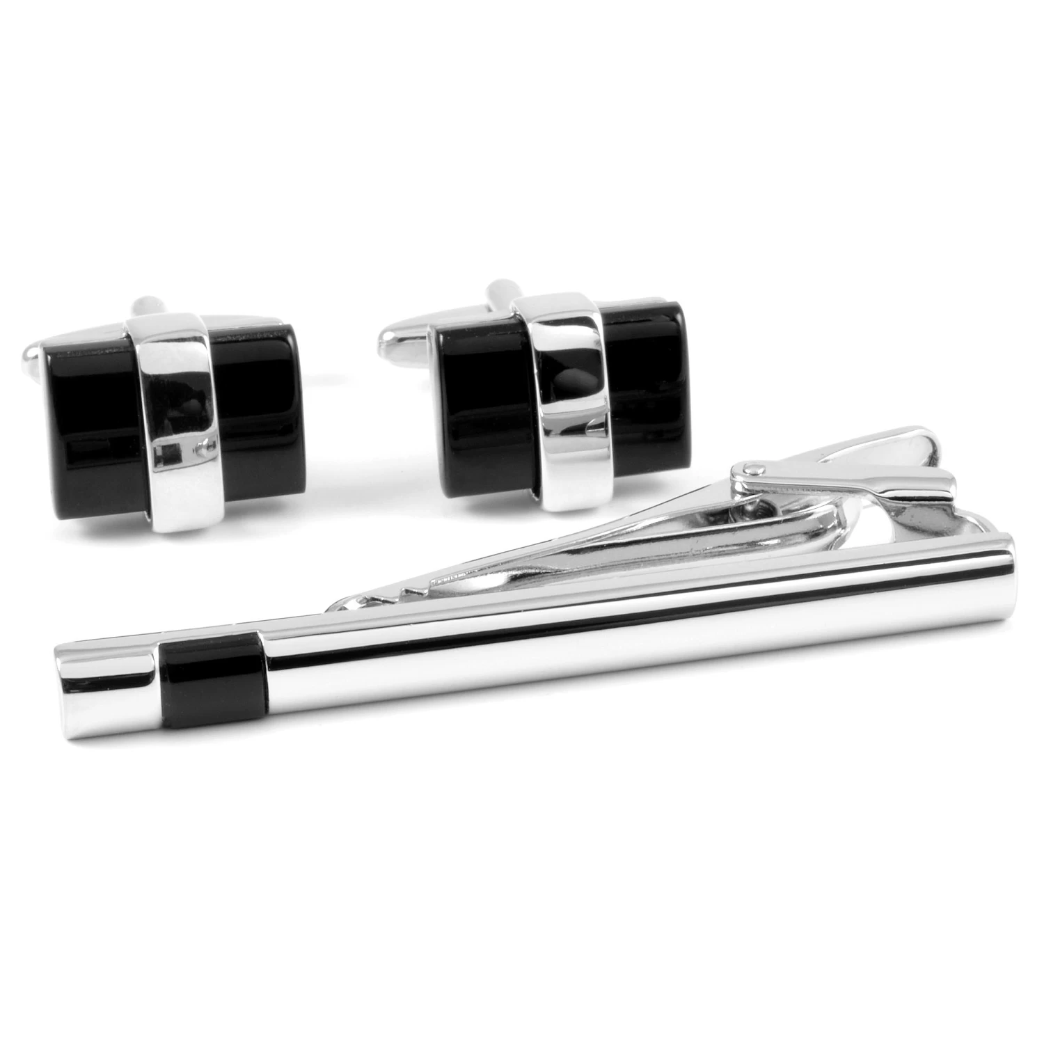 The cufflinks feature a rectangular black slab with a simple silver frame holding it in place. The tie clip comes in that same silver tone, with a coordinating black detail on one end. Perfect for semi-wide and wide ties.