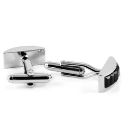 The curved cufflinks are embedded with 7 sleek, black cubic zirconia stones, while the tie clip boasts 3 on the far end of its stunning silver-toned surface.