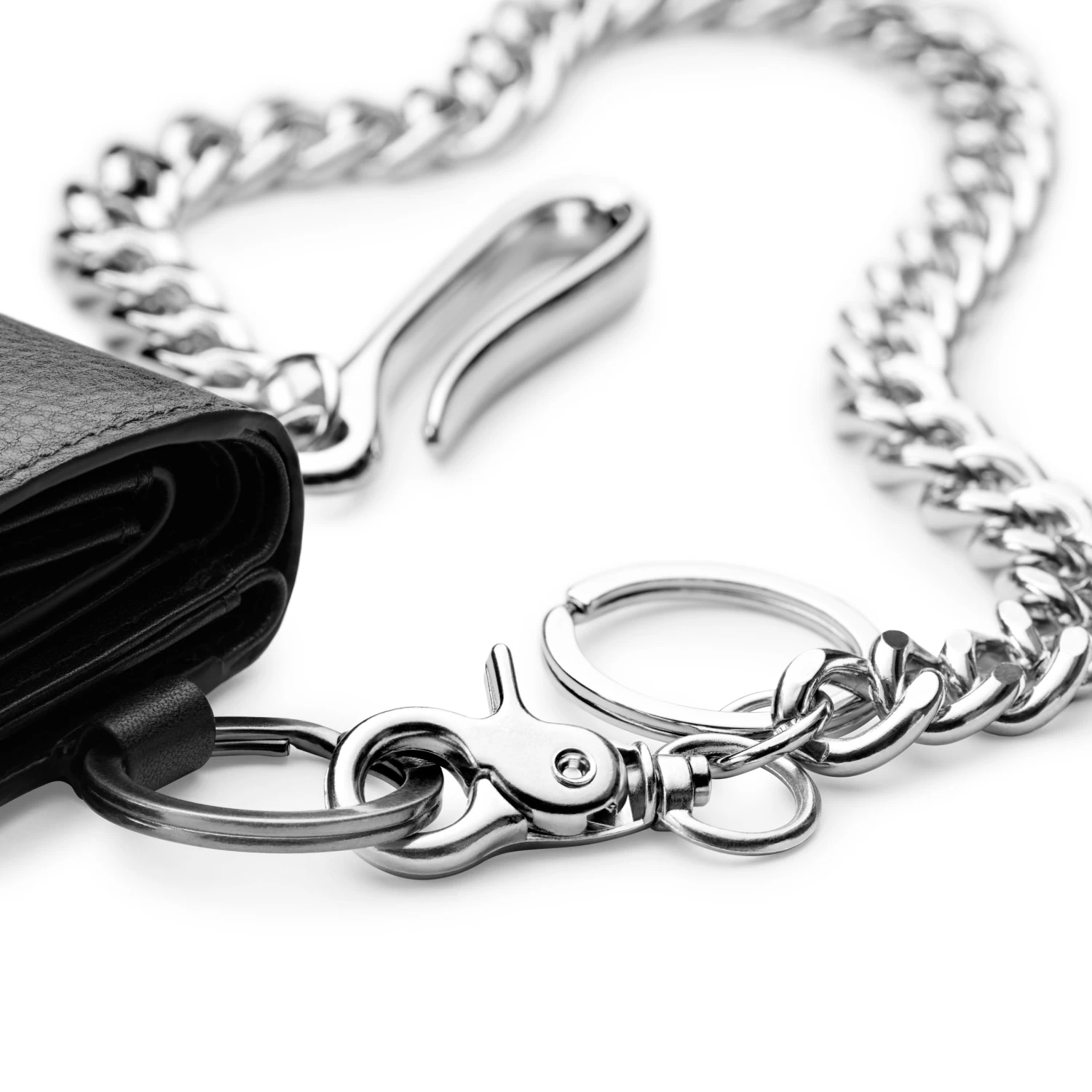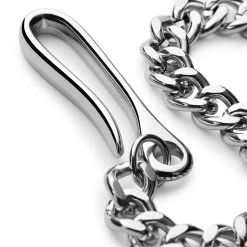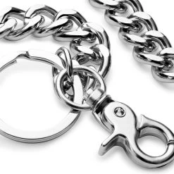 This silver-toned men’s wallet chain hooks to the front of your pants with a long, thin hook that rests on your belt loop. Strong lobster claw snap hooks securely attach to your wallet.