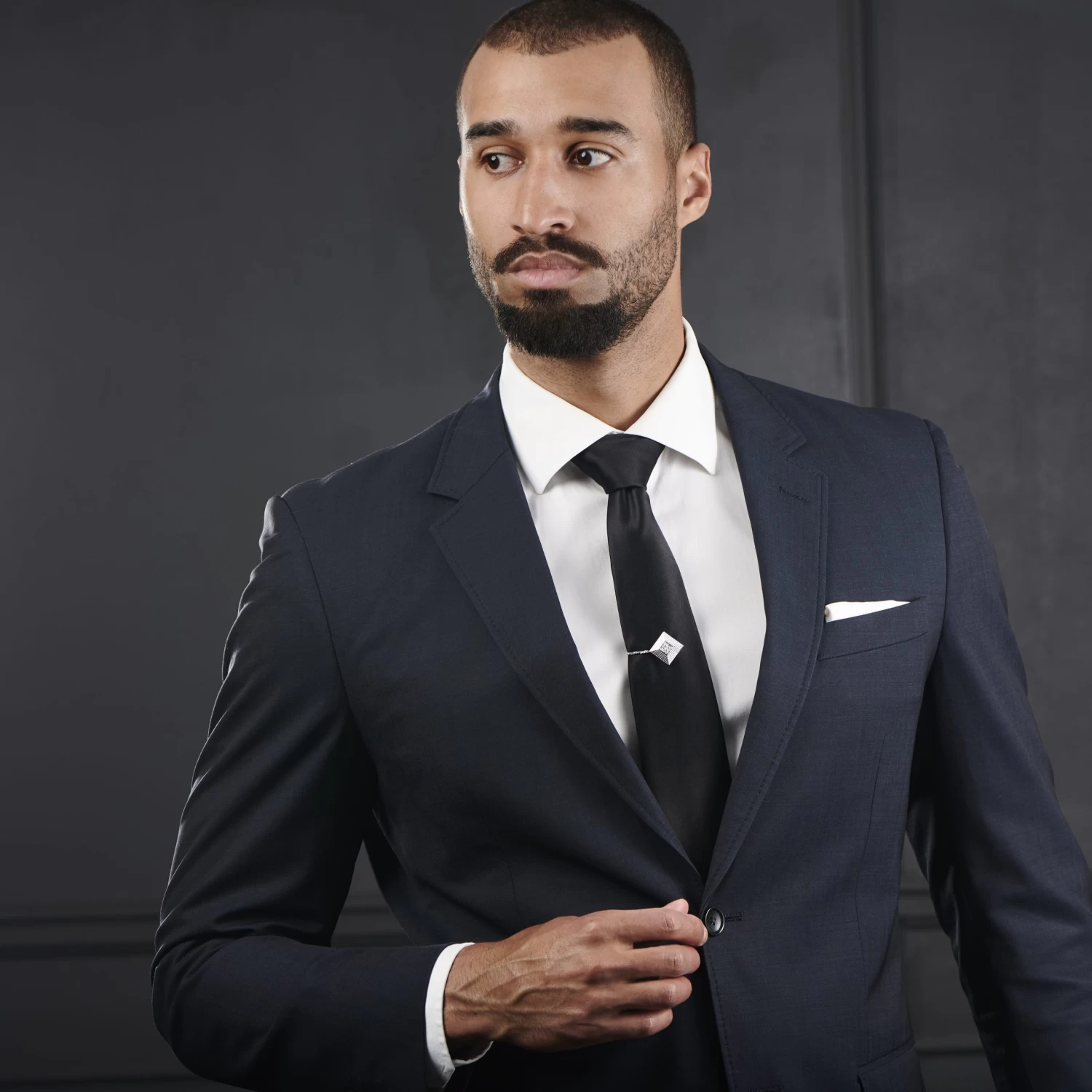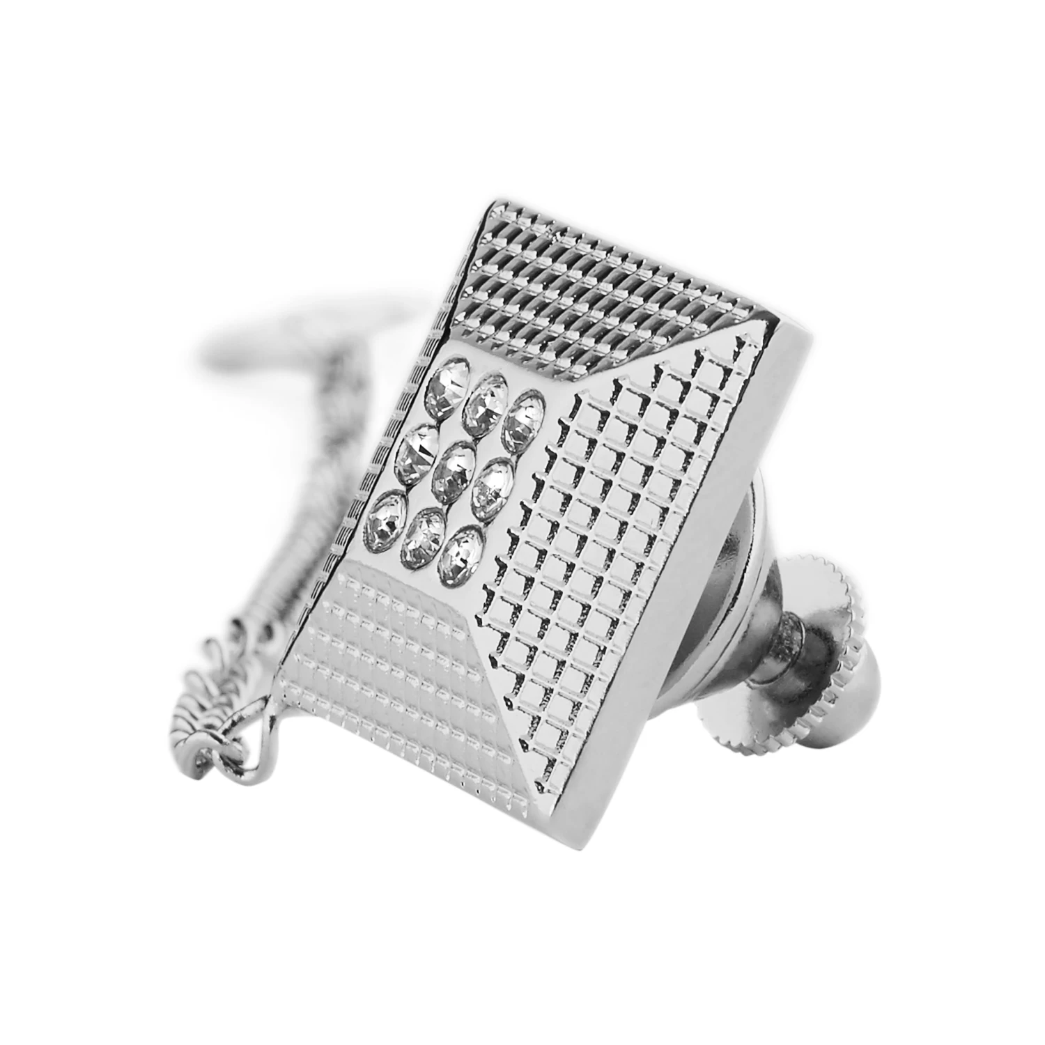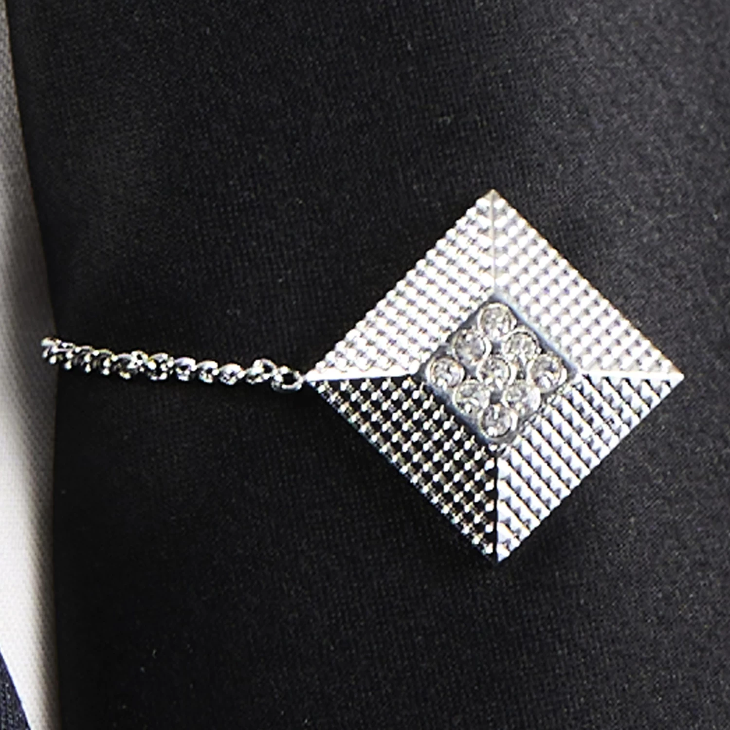 Secure your neckwear with this stunning tie pin chain. Features a smart pyramid motif encrusted with clear crystals. Simply pierce your tie and shirt placket and secure from behind using the strong clasp. The chain attaches to a button behind your neckwear for added charm and security.