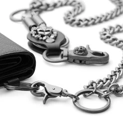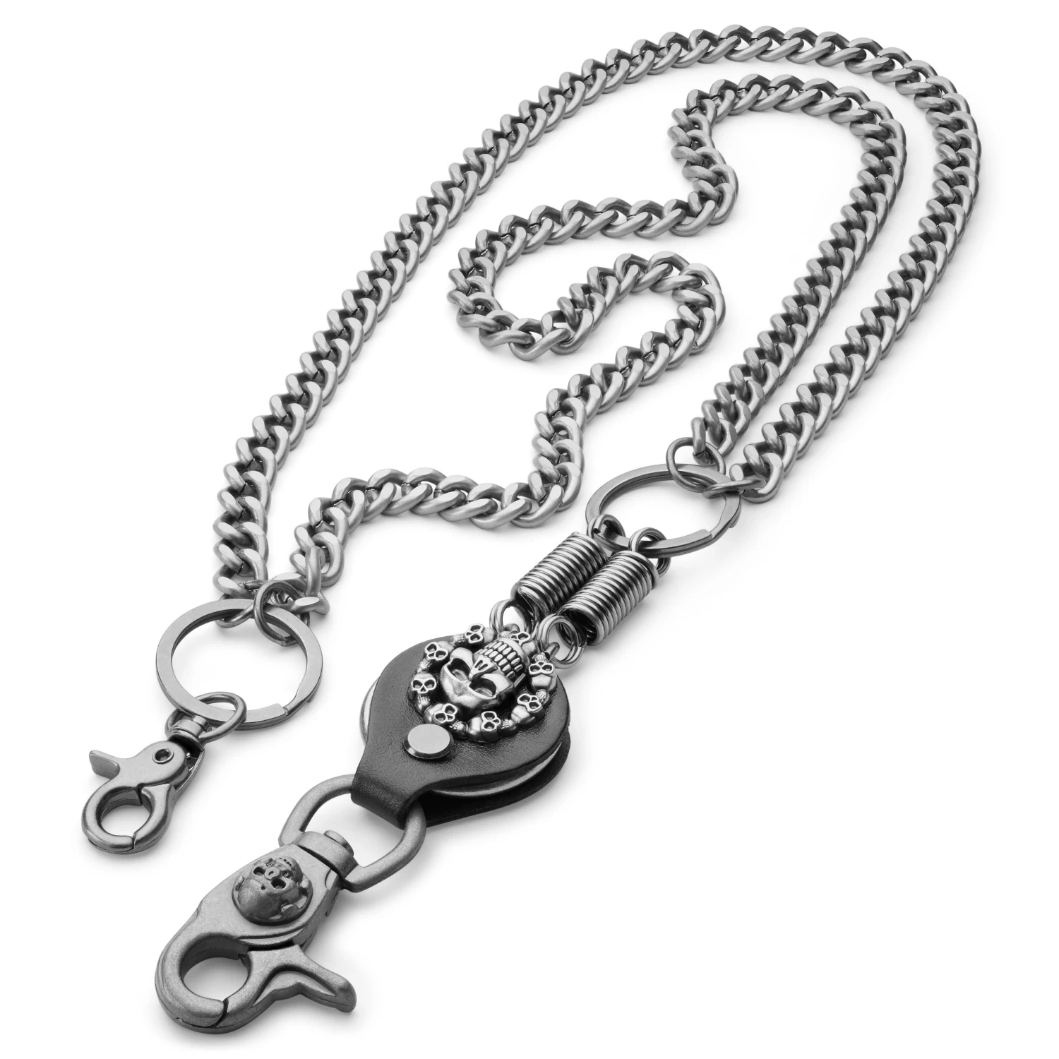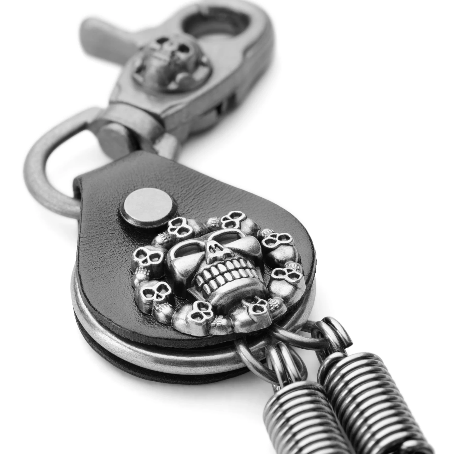 Why settle for 1 skull when you can have 10. This gunmetal-colored metal wallet chain features a dual chain design and ten skulls to scare off potential thieves as they approach your wallet.