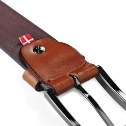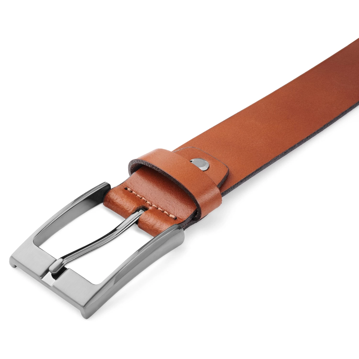 Add a touch of warmth to your look with this tan men’s belt. Crafted from top-grain leather that develops a handsome patina over time – a look and feel unique to your belt. Fastens securely with a zinc buckle – polished for sleekness.