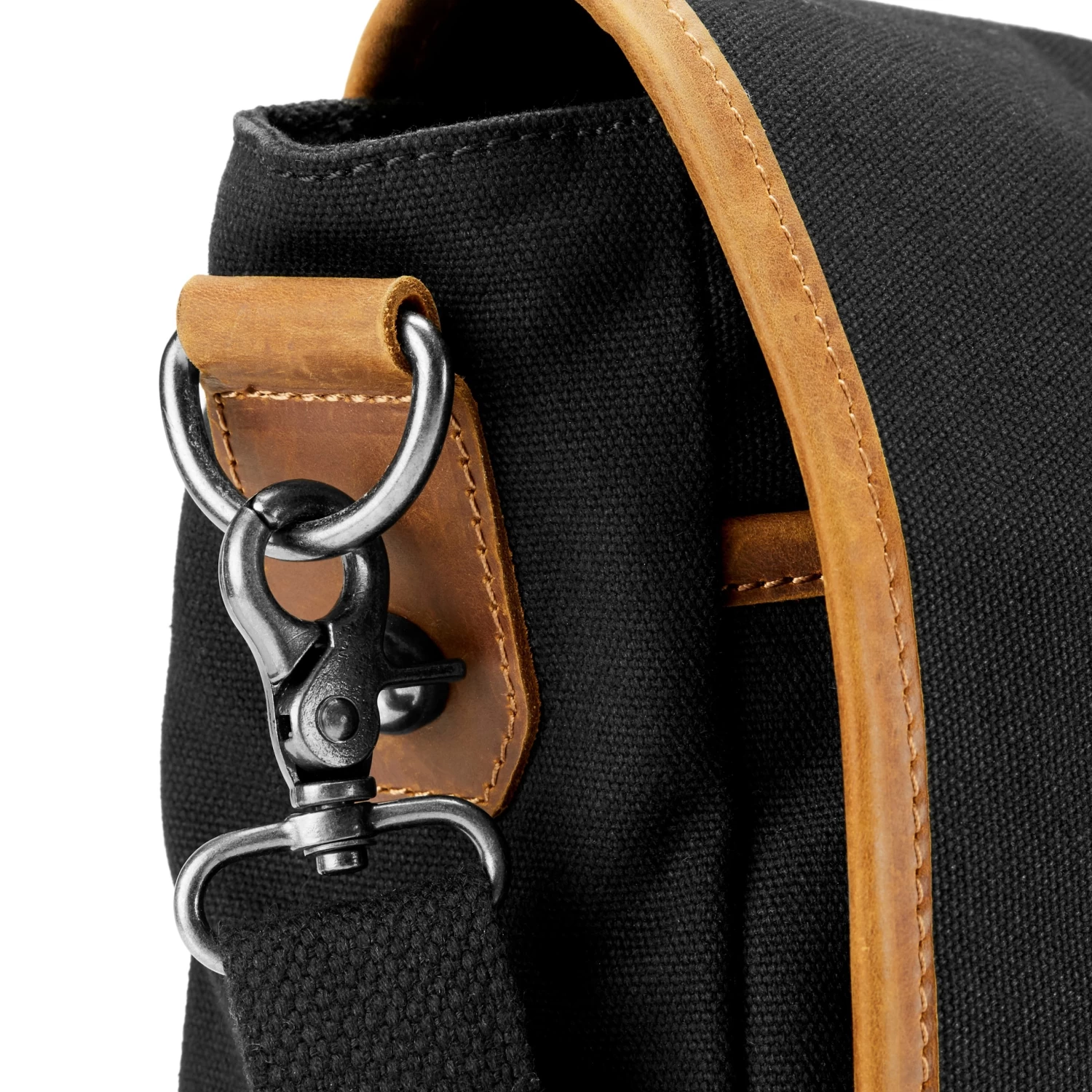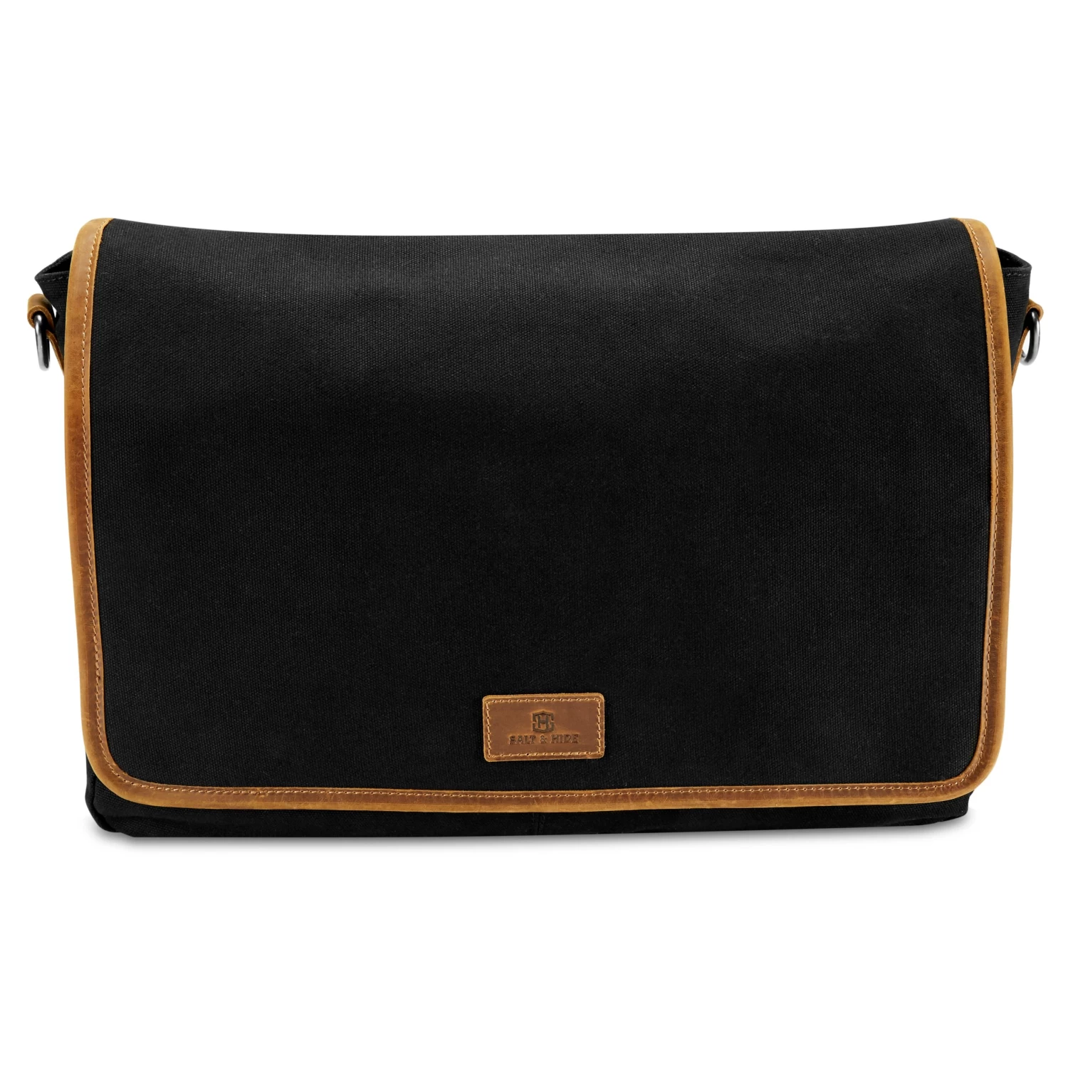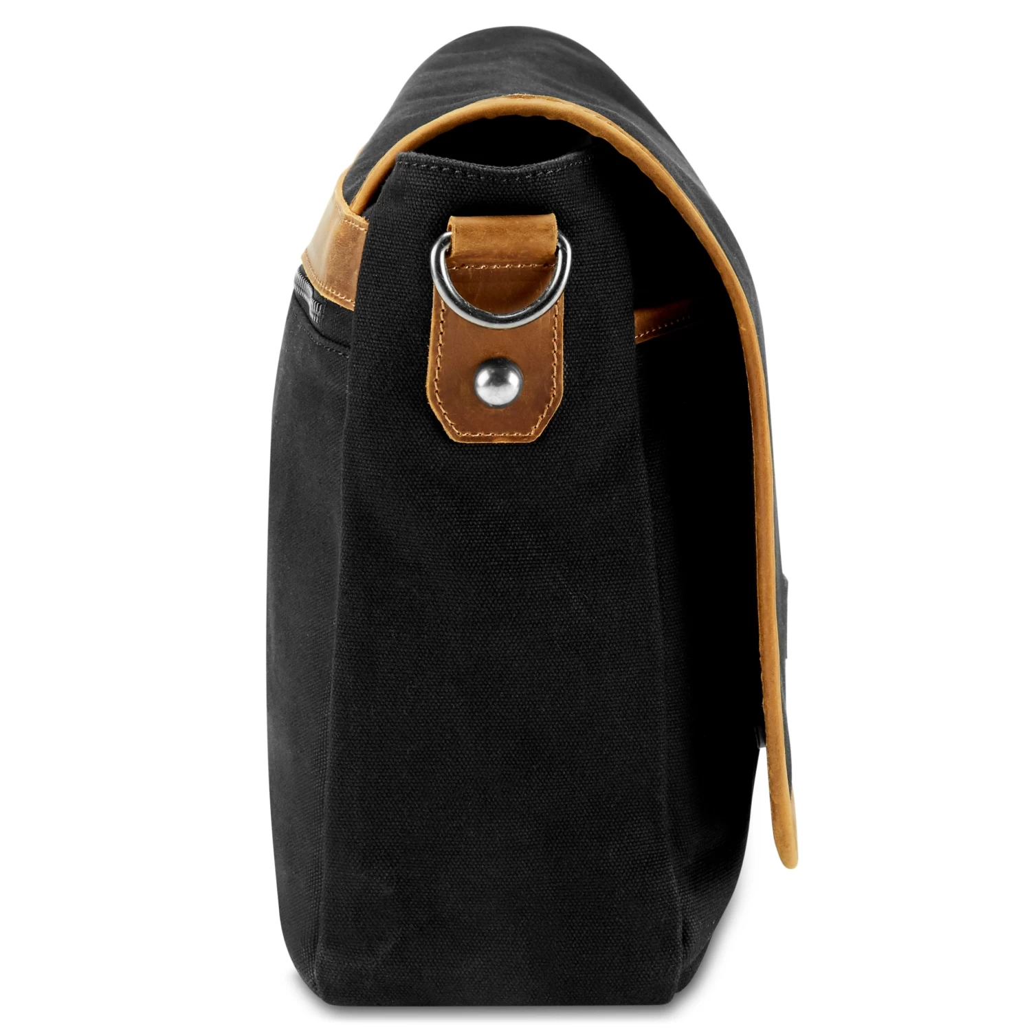 The flap closes securely with magnetic press studs. Black cotton canvas and rugged leather detailing give this messenger bag a relaxed, well-traveled vibe and improve in feel and look over time.