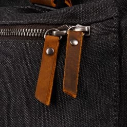 Bag is crafted with durable materials such as cotton canvas, genuine leather, YKK zippers, and metal accents.