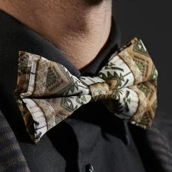 This brown and khaki print bow tie strikes a bold look. A contemporary twist on a 60s Aztec print, it makes a great focal point, drawing your ensemble together.